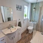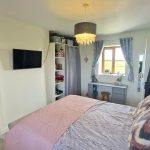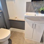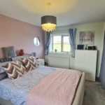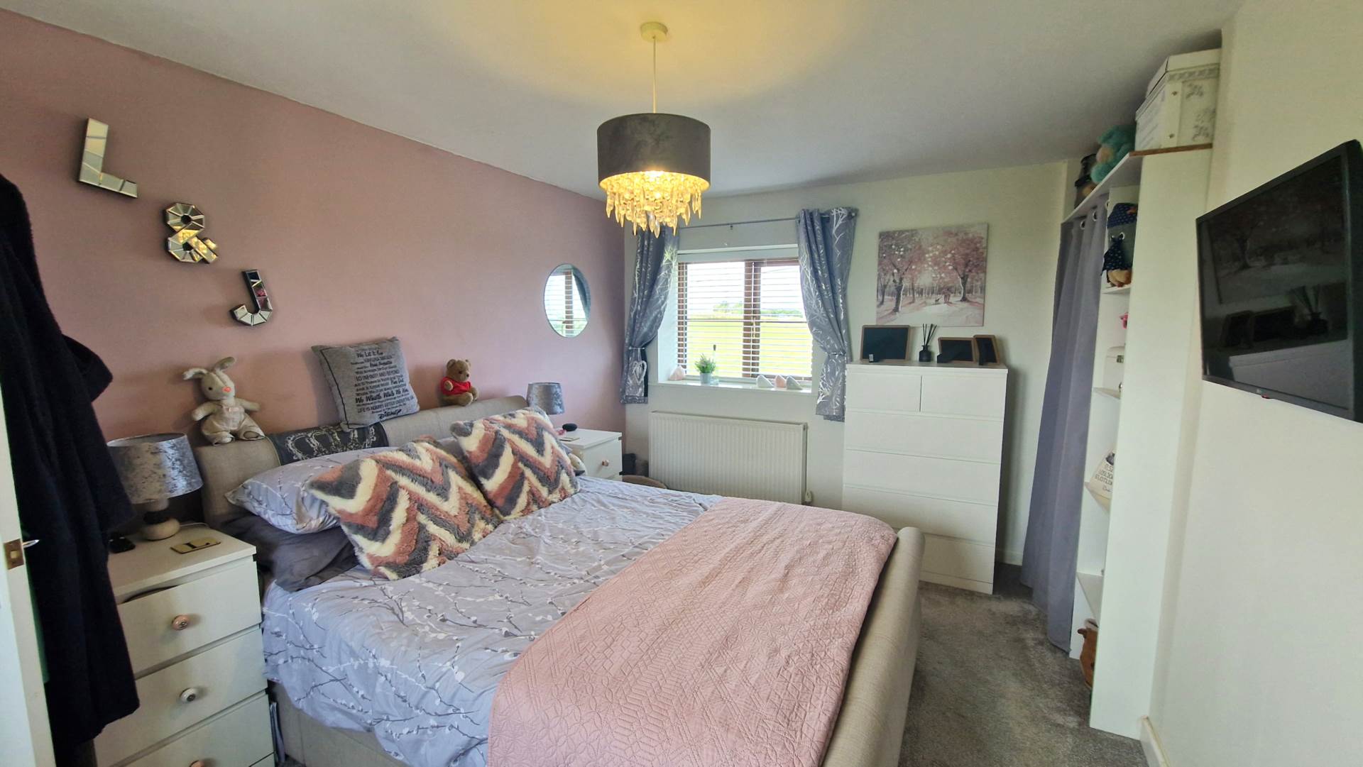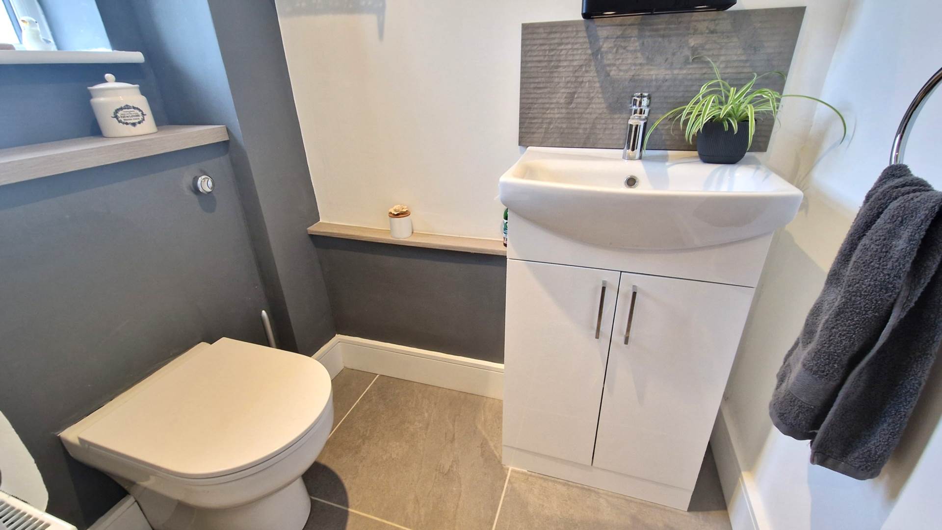 From the parking area to the front, enter through a composite, high security front door into a hallway with bedroom 2 to the right and a downstairs WC to the left. The bedroom has a window looking out to the front and would be ideal as a guest bedroom or study. The WC is modern with a low level WC with recessed cistern, sink on a vanity unit with storage, tiled floor, and radiator. Opaque window to the front aspect.