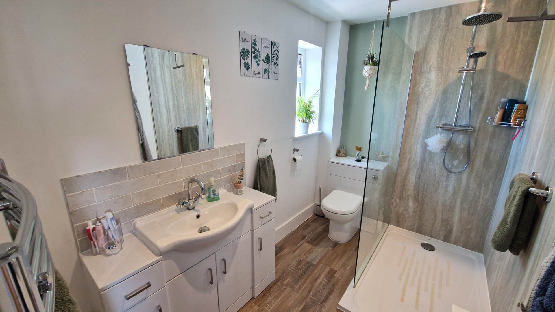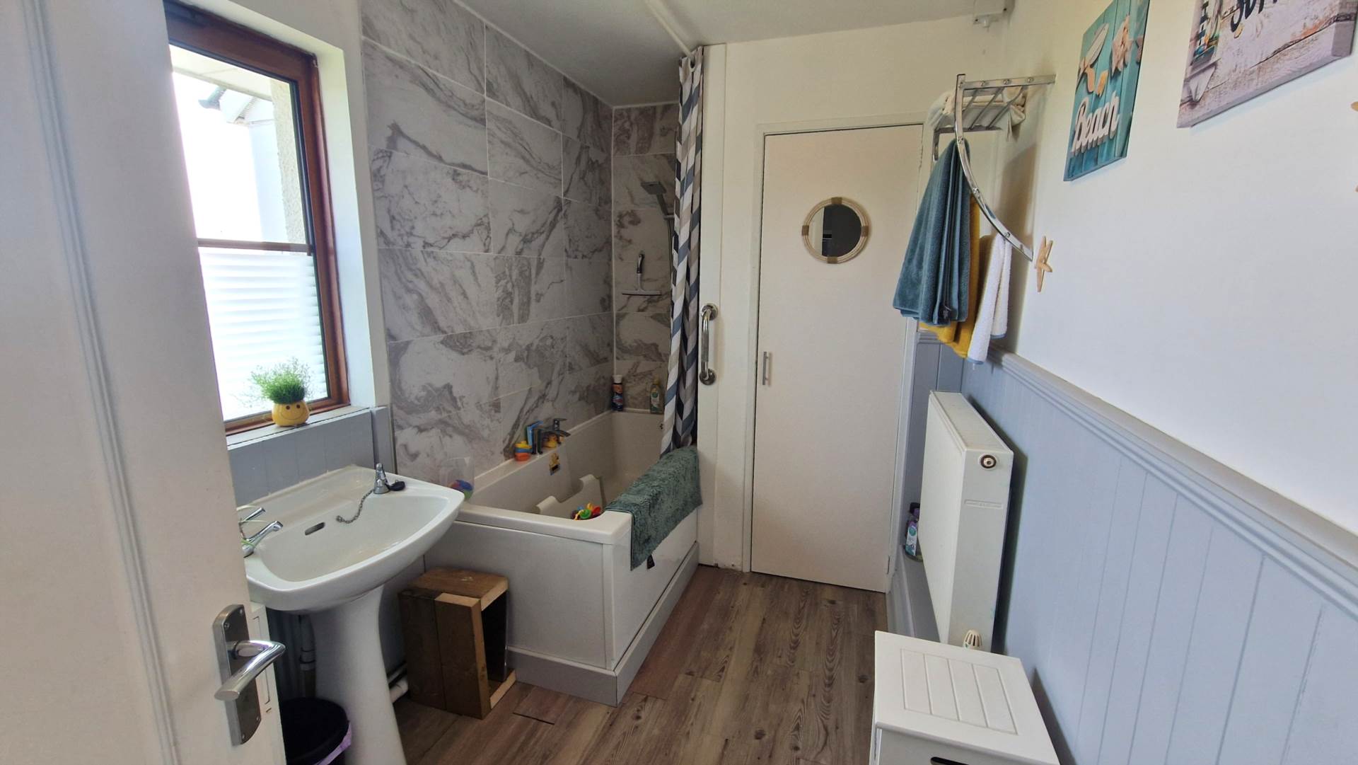 The family bathroom is very well appointed with a panelled bath fitted into a recess, creating an ideal shower enclosure with a mains shower fitted. Pedestal wash hand basin and low level WC. A window looks out over the rear garden and countryside beyond.