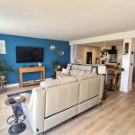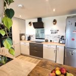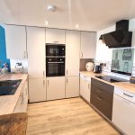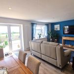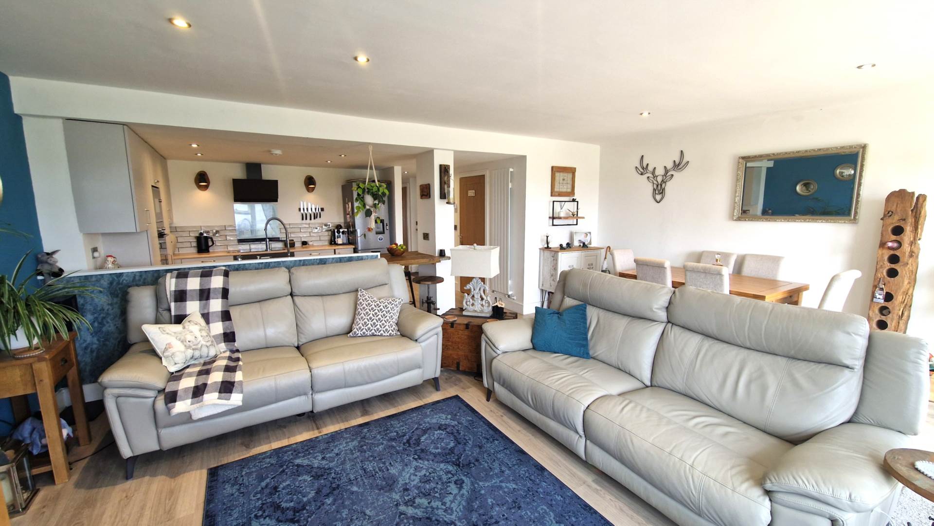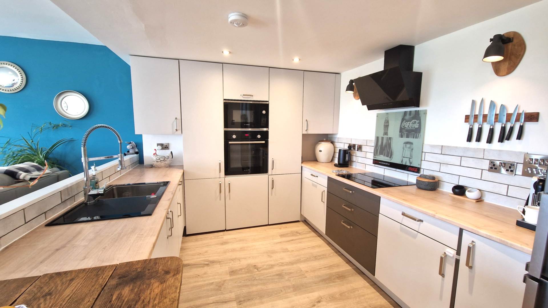 Moving on through the hallway, there is a small utility room with cabinets and worktops which has all the plumbing necessary to be converted into a wet room, should that be required. The hallway opens out into an expansive kitchen/dining/living space. The kitchen area is beautifully appointed with a custom German kitchen with many features such as full length cupboards, Bosch appliances, composite and stainless steel sink with spray mixer tap, and light oak worktops.