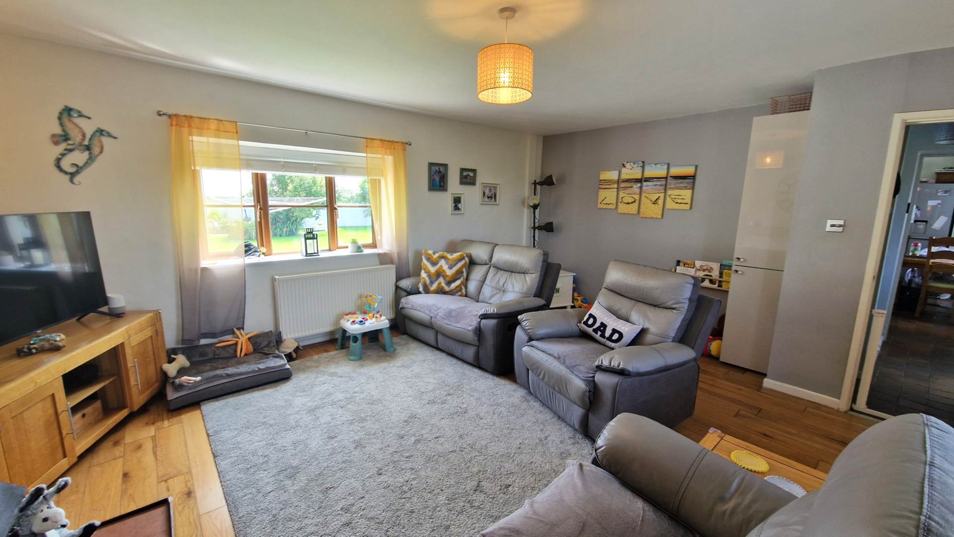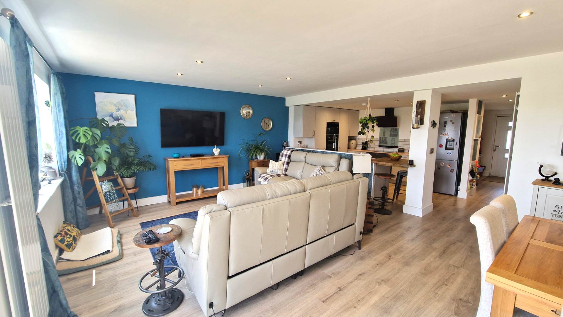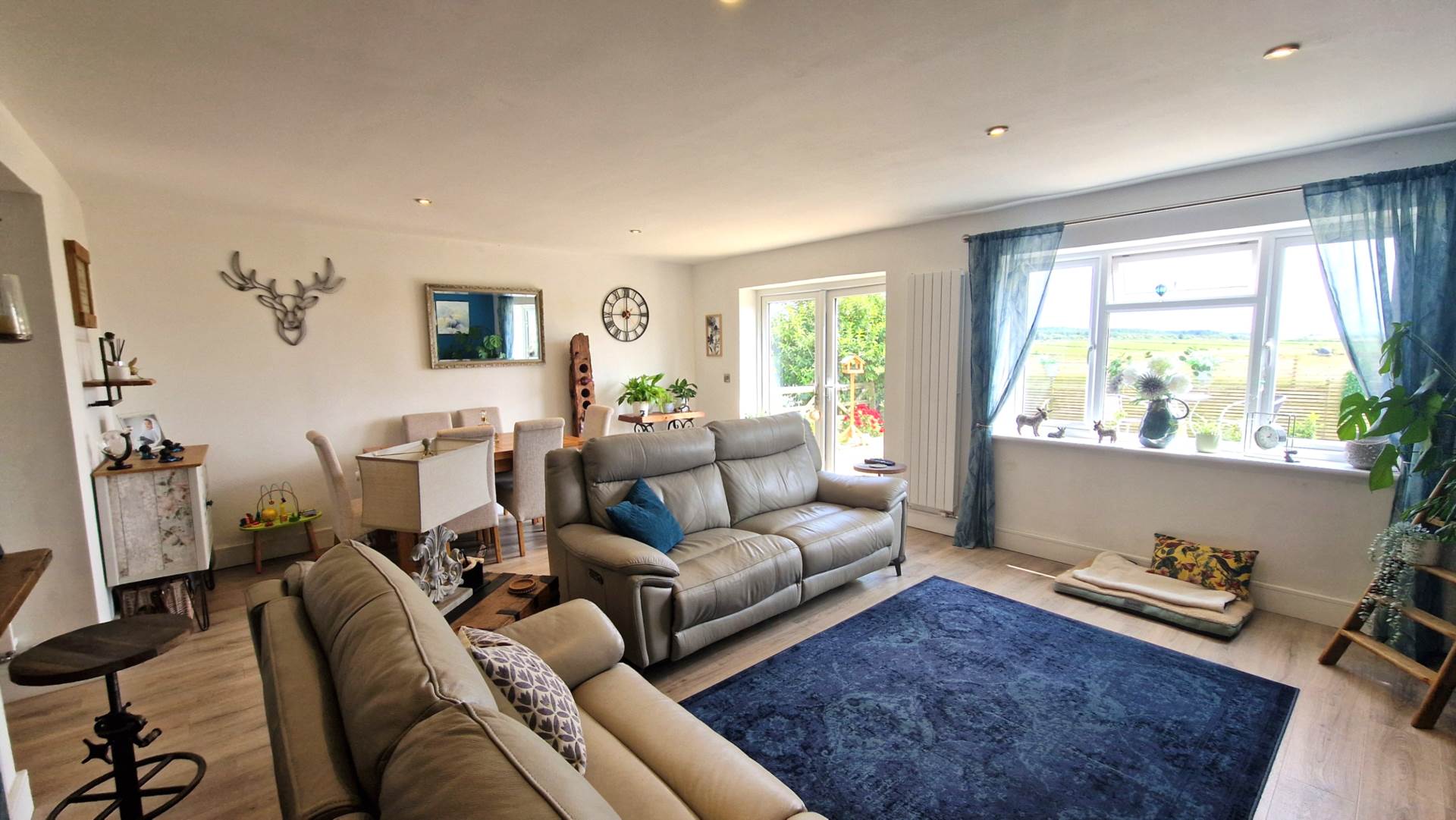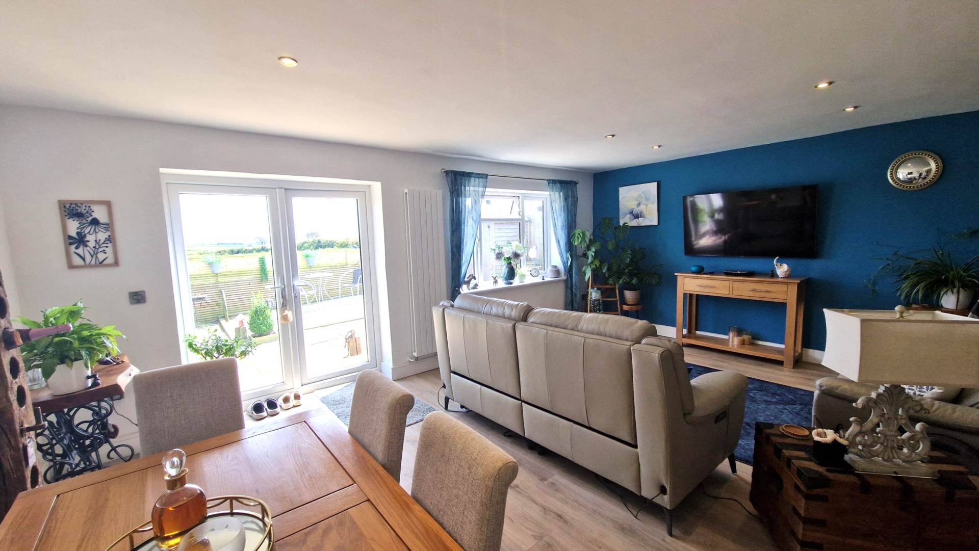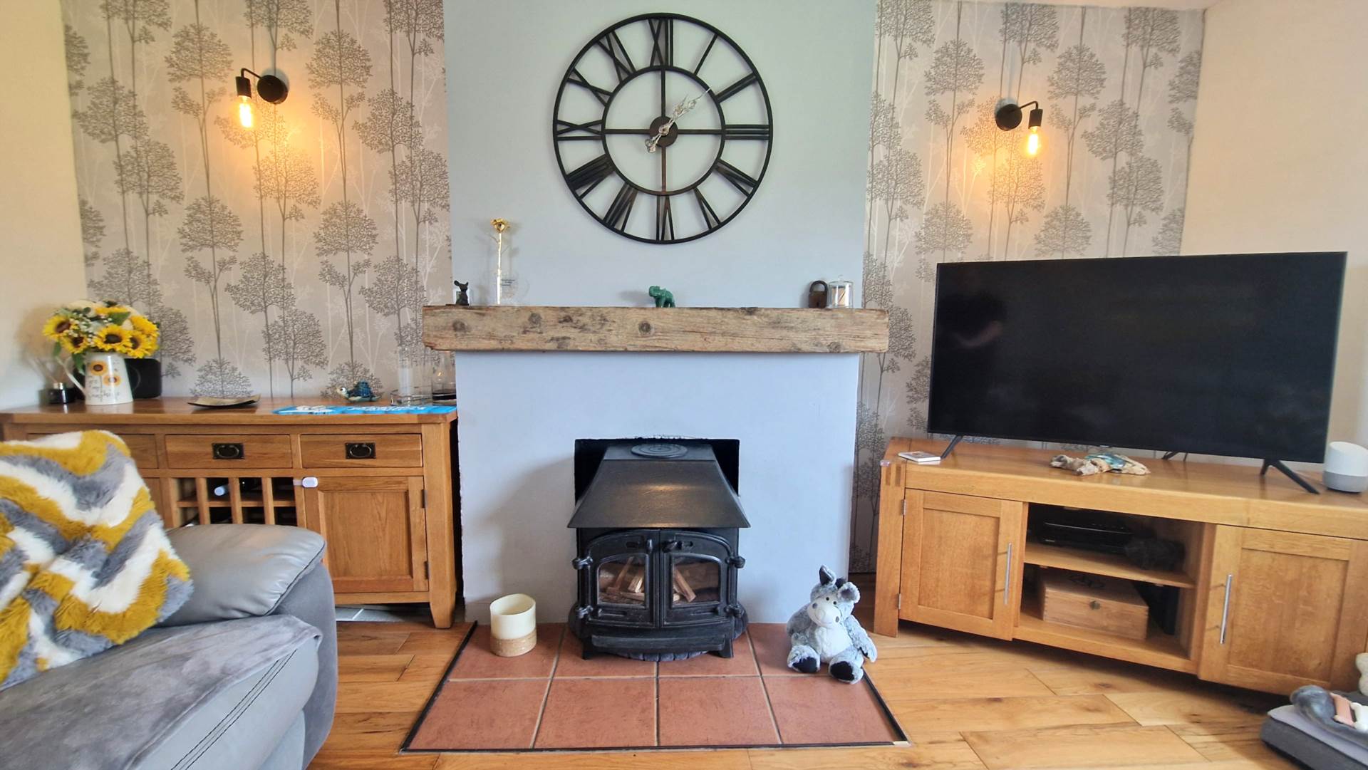 The lounge is a large bright room with large windows to the front and rear. The flooring is of engineered Oak. A chimney breast is to the side wall and has a multi fuel burner fitted on a tiled hearth. There is a central heating radiator under each window.