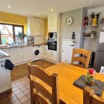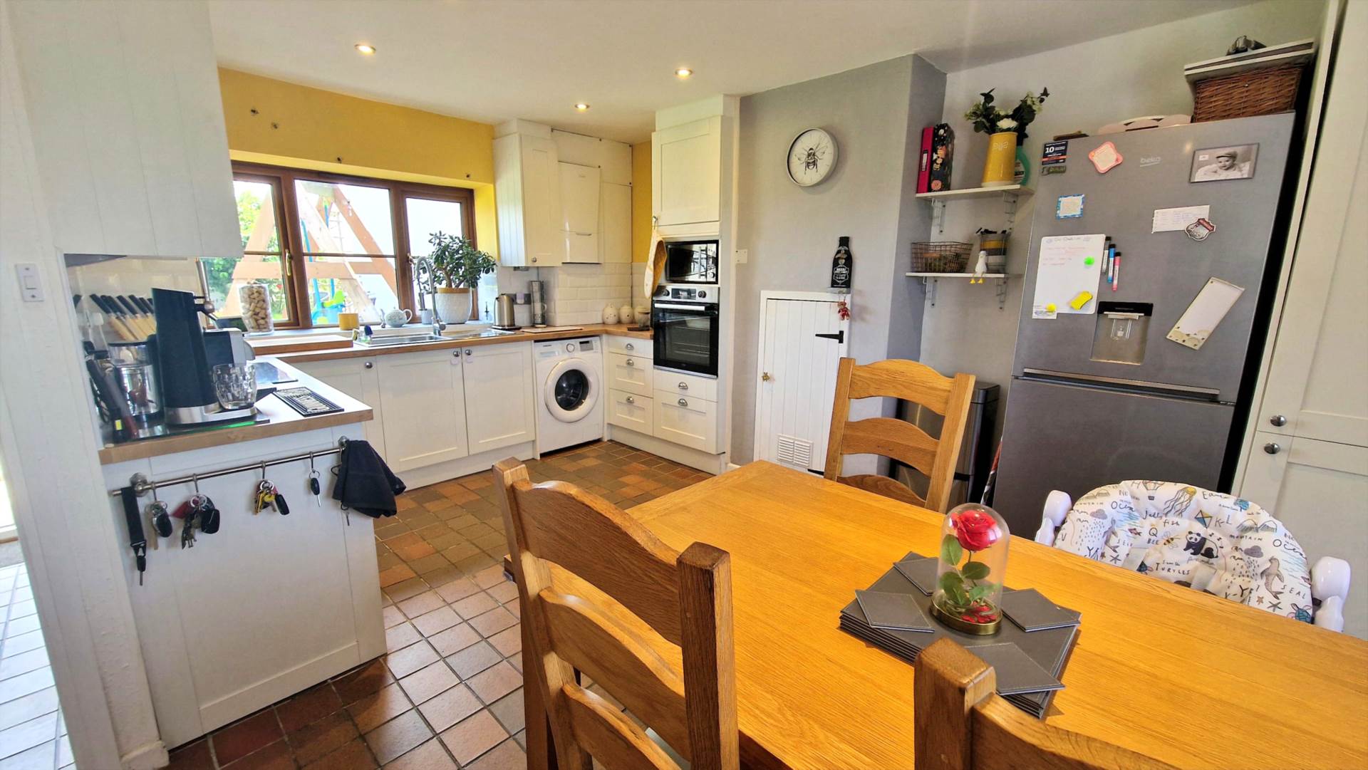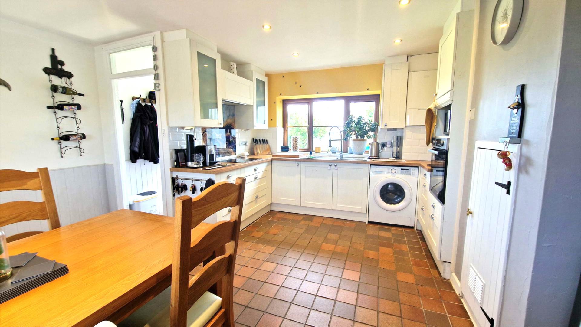 The Kitchen/Diner has a stone tiled floor. There are windows to the front and rear aspects, and with the white wall and base units and light wood worktops, this is a bright and cheerful space for entertaining. There is plenty of room for all appliances and a 6-8 seat dining table and chairs. A further door gives access to a rear hall which has a door giving access to the garden, and a door which opens into the downstairs WC which has a modern white suite comprising a sink on a vanity unit with storage, and a low level WC.