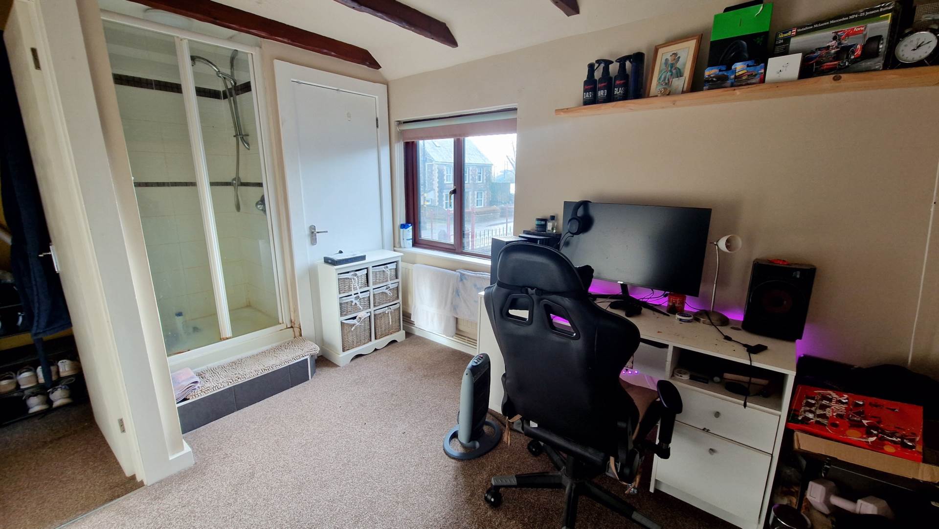 Separated into 2 equal sections by a stud wall and door. The first section has a built in Shower cubicle with mains shower fitted. Window to the front aspect. Radiator. The second section has a window to the front and a window to the side aspects. Radiator.