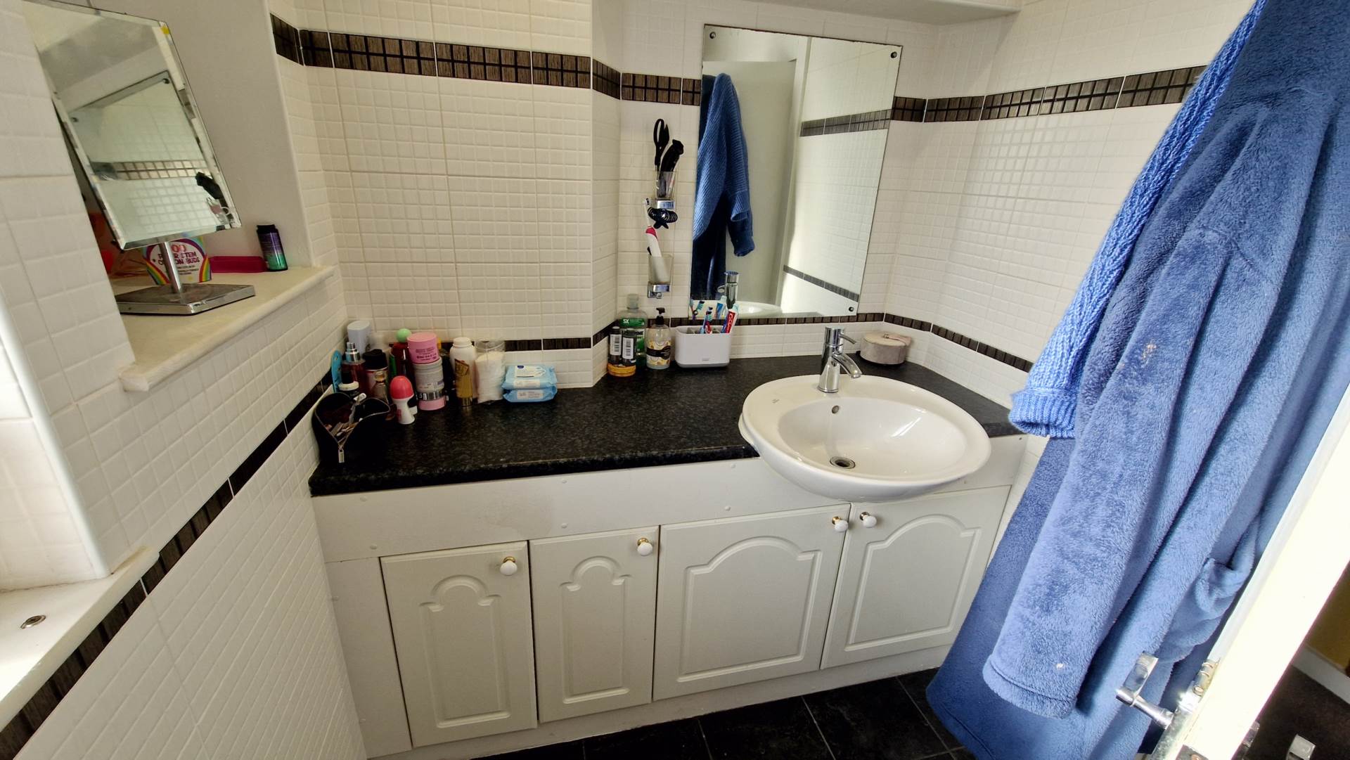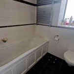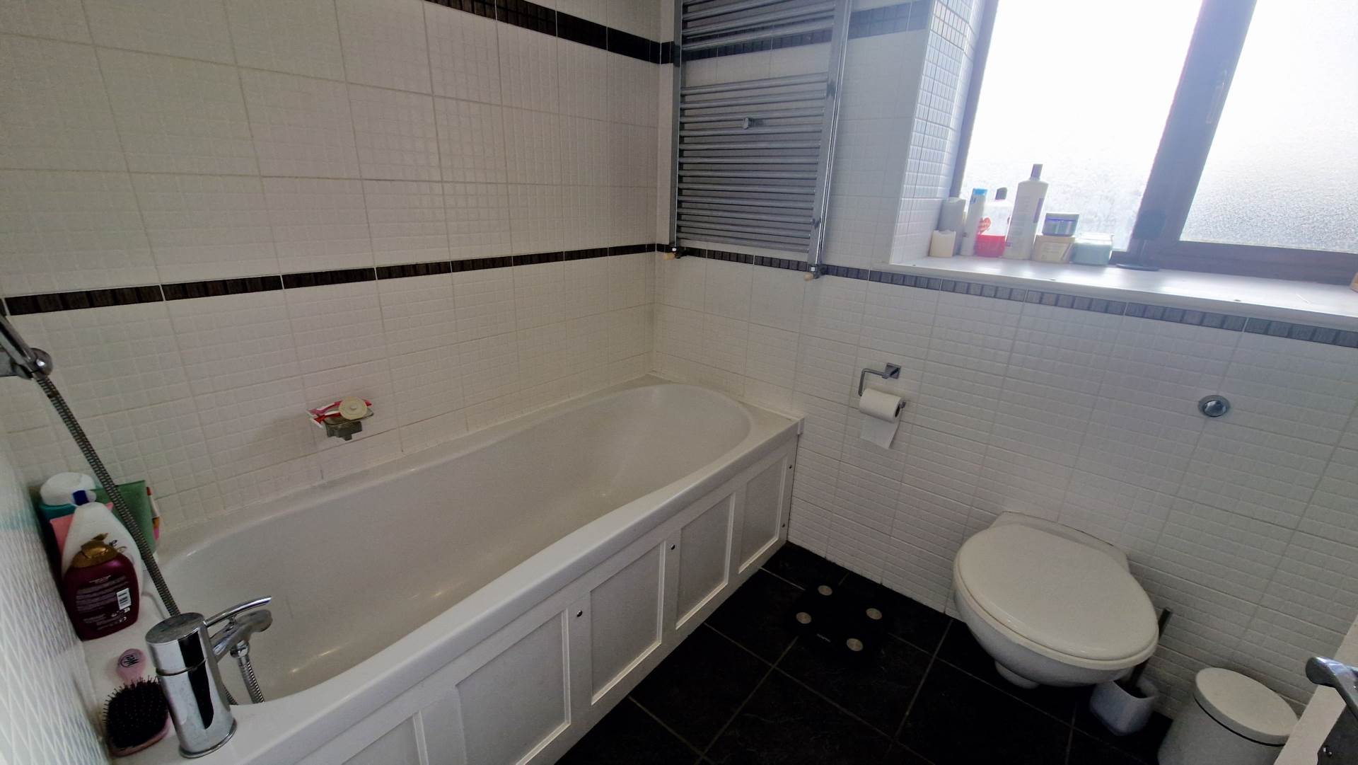 Tiled walls and floor. Window to the side aspect. Panelled bath with hand held mixer shower. Low level recessed WC. Sink on a large vanity unit with storage. Heated towel rail. Spot lighting.