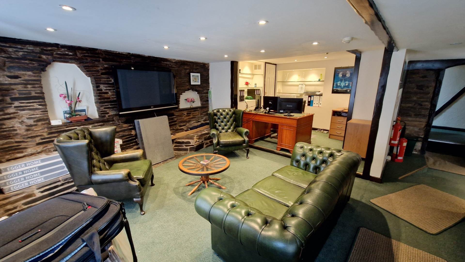 Upon entering through the glazed, wood effect Upvc door, you are in a large lounge area with a raised office area to the rear. There is also a window to the front aspect. To the right there is a large opening to the main office. To the left is a large stone and slate open fireplace with display recesses to either side. Central heating radiator. Spot lighting. Head height is 2 meters.