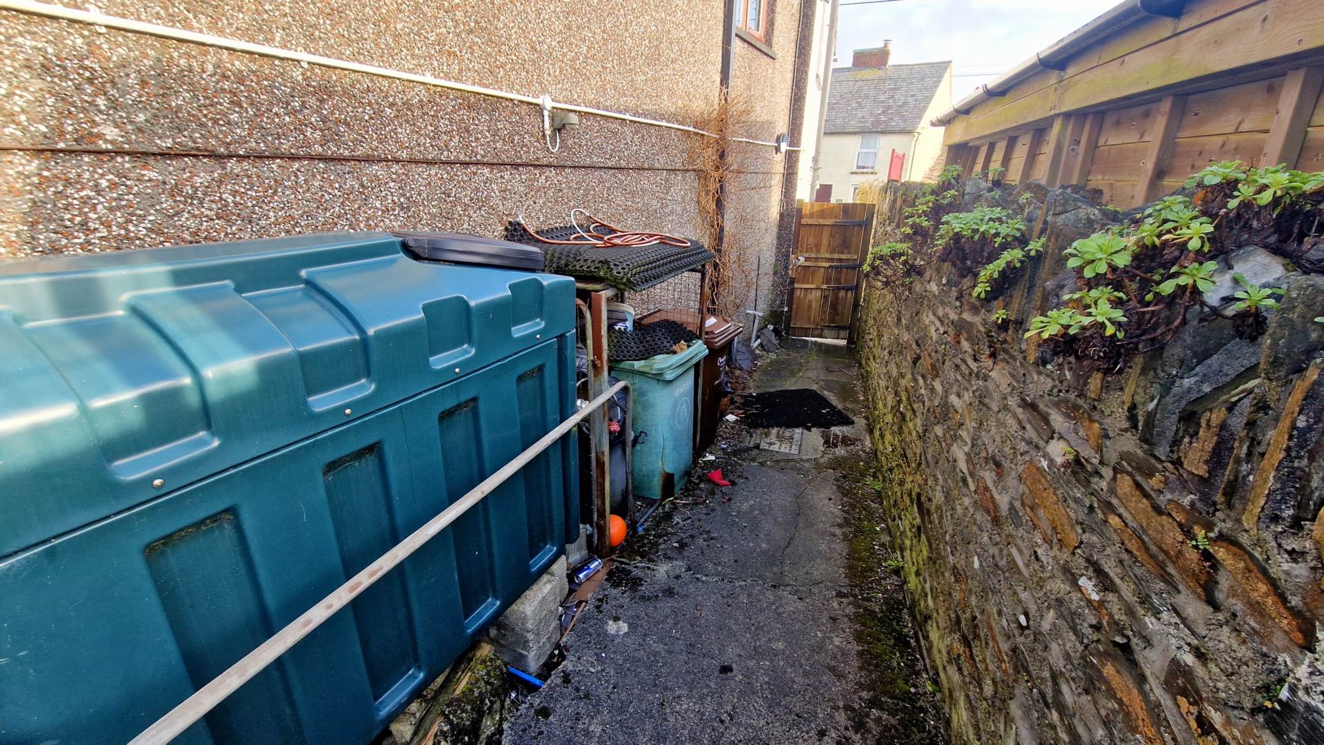 To the rear is a paved walkway and steps leading up to an extensive, raised decking area with a stone wall boundary. A storage shed stands at one end. The path leads around the side where the oil tank is located. A side gate leads out to the front. An access path at the rear leads around Manderlay Close and comes out at the parking area which is large enough for up to four cars. This is also the access to Manderlay Court.