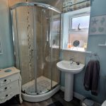 Large corner shower with glass enclosure and an electric shower fitted. Low level modern WC. Pedestal wash hand basin. Two diffused windows to the rear aspect. There is also plumbing and drainage for a washing machine.