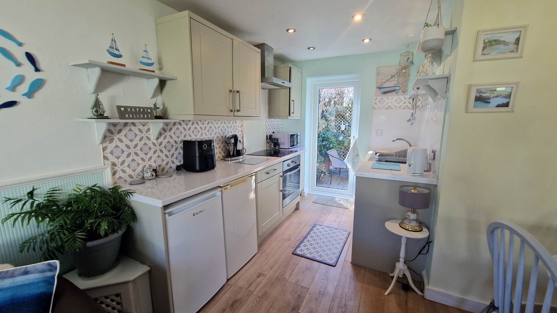 To the rear, the lounge opens to the kitchen area where a glazed door gives access to the rear garden. The kitchen itself is well equipped with light grey wall and base units with white sparkle laminate worktops and splashback with an integrated stainless steel one and a half bowl sink unit with mixer tap, an integrated electric oven with a new four ring hob and extractor fan above. Under counter fridge and freezer. The kitchen space has ceiling spot lighting.