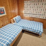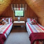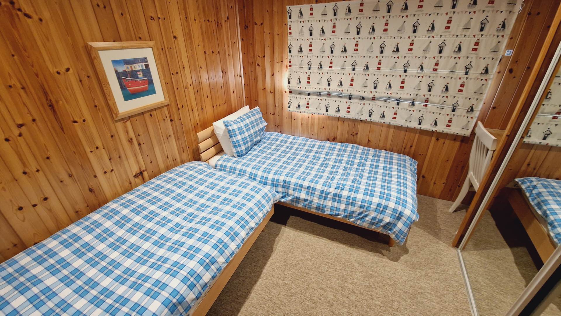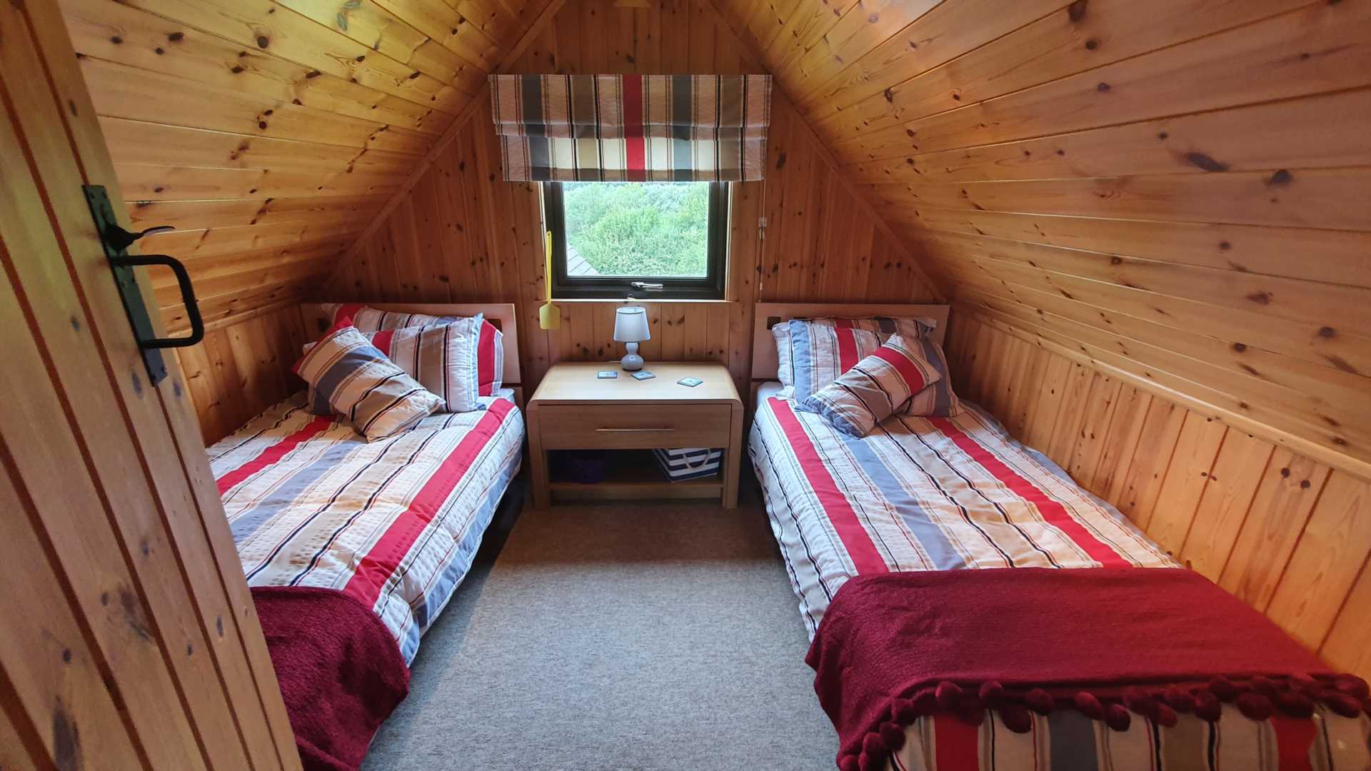 Timber clad walls and sloping ceilings. Twin room with double glazed window to the rear.