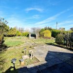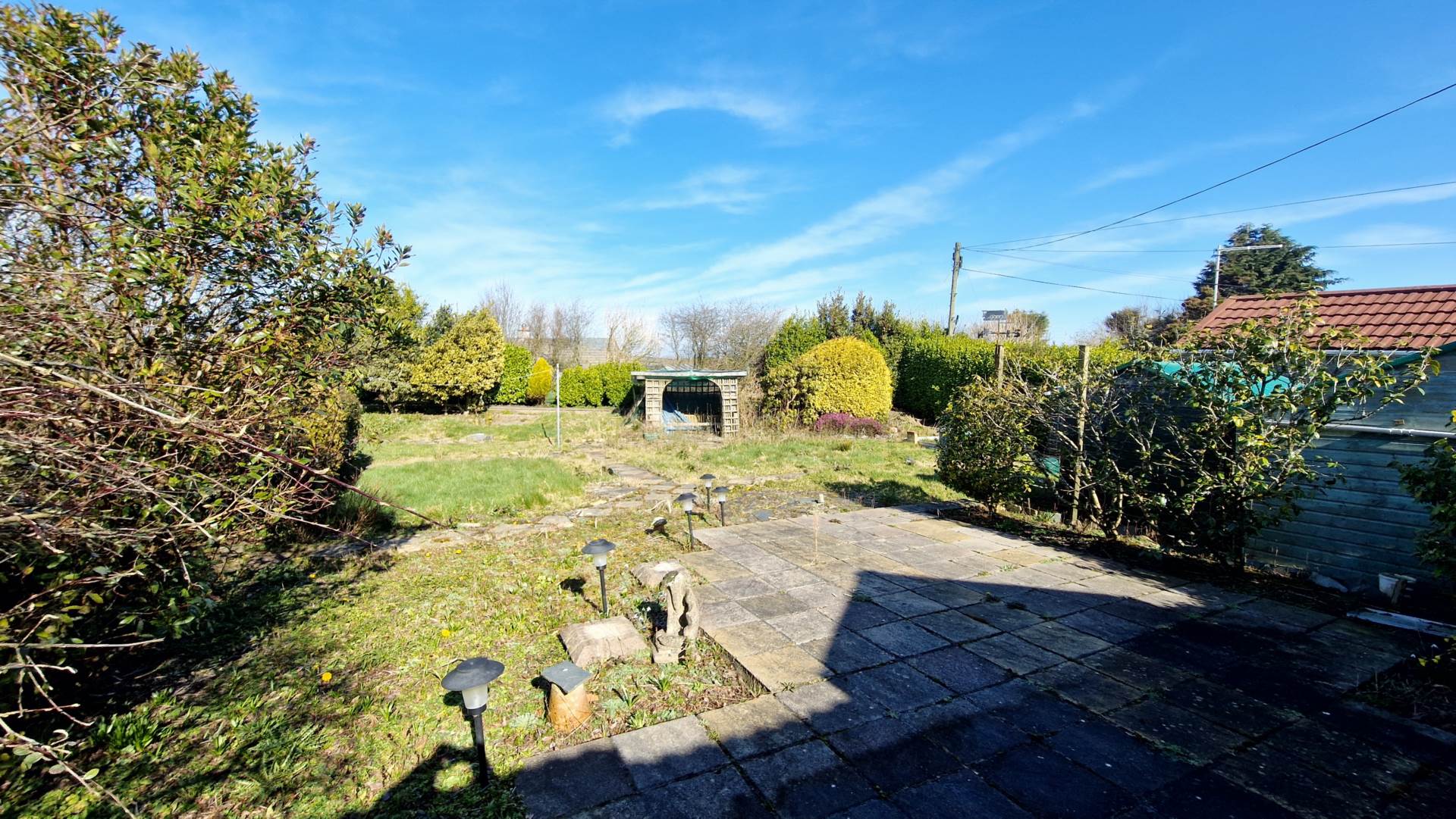 To the rear there is a large patio area with lawn and planting areas beyond with various trees and shrubs. To one side there are two wooden storage sheds. The boundary is a variety of trees and shrubs with a wall to the rear. The side of the property overlooks an open field with horses.