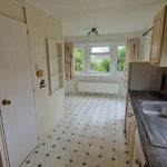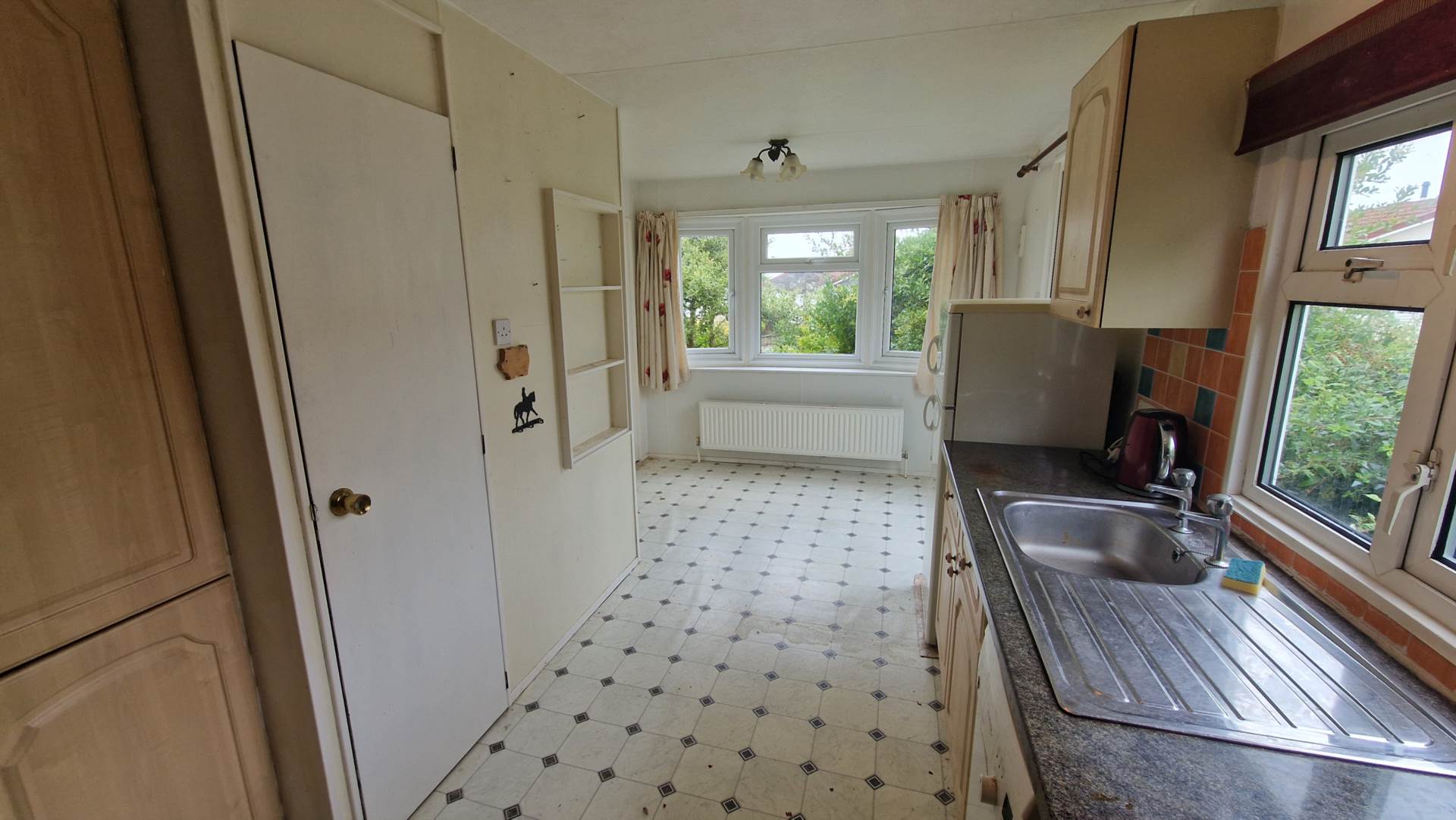 Large bay window to the front aspect. Further window and part glazed door to the side aspect. Various wall and base units with roll top work surfaces. Inset stainless steel sink. Room for a dishwasher, fridge freezer, and cooker. Large storage cupboard. Central heating radiator.