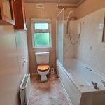 Opaque window to the side aspect. Panelled bath with electric shower and glass splash screen. Low level WC. Pedestal wash hand basin.
