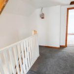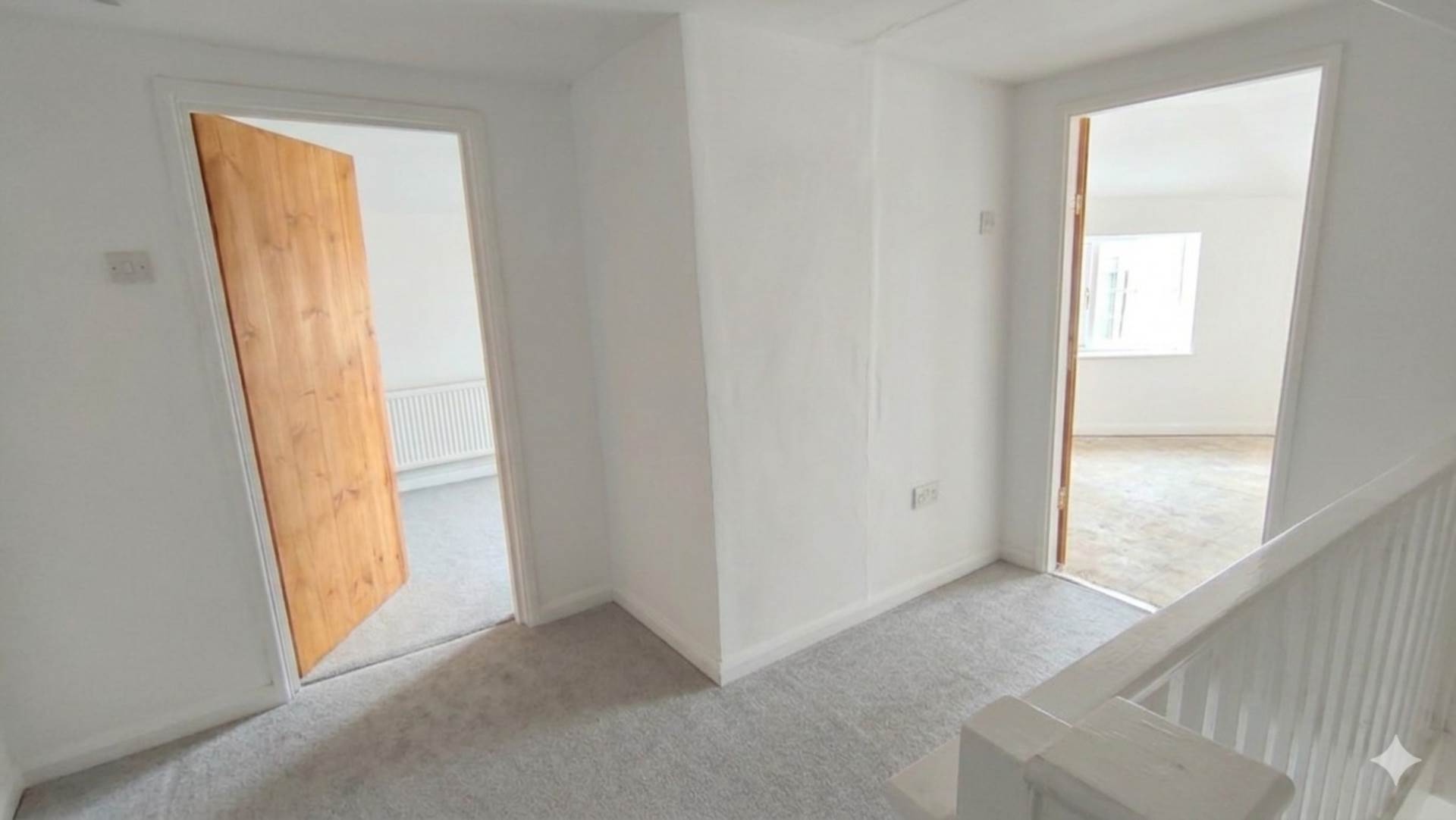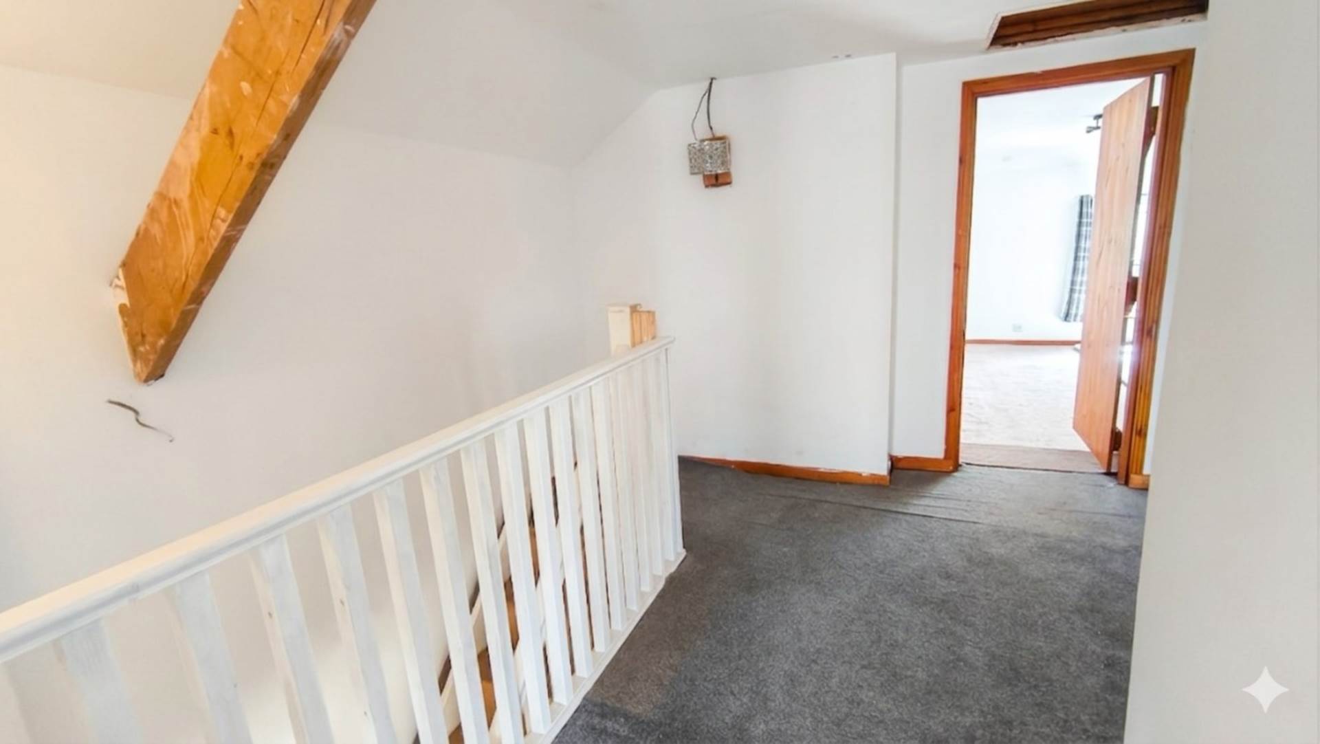 Large, open balcony hallway with doors to all three bedrooms. Exposed beam, and loft hatch.