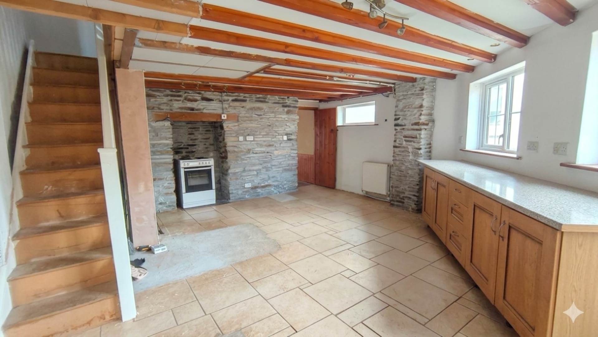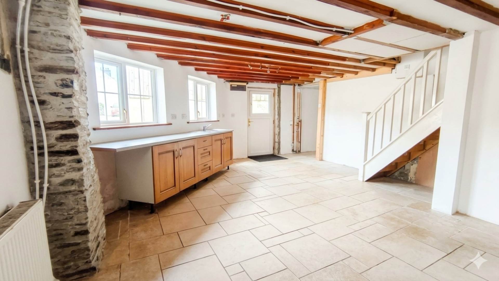 A large, bright and light room with a high level window and two large windows to the side angled wall and a upvc stable door to the rear giving access to the garden. There are cupboard units with a worktop to one wall and a cooker installed into the stone wall alcove. Stairs rise to the upper floor, and an opening gives access to a door to the shower room. It should be said that the kitchen/diner is in mid renovation, just waiting for the new owner to put their individual stamp on it. Radiator.