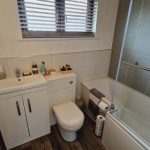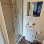 An up to date shower room comprising an enclosed walk in shower (mains) with glass screen. Sink on a vanity unit with storage, and a low level WC. Heated towel rail, and extractor fan.
