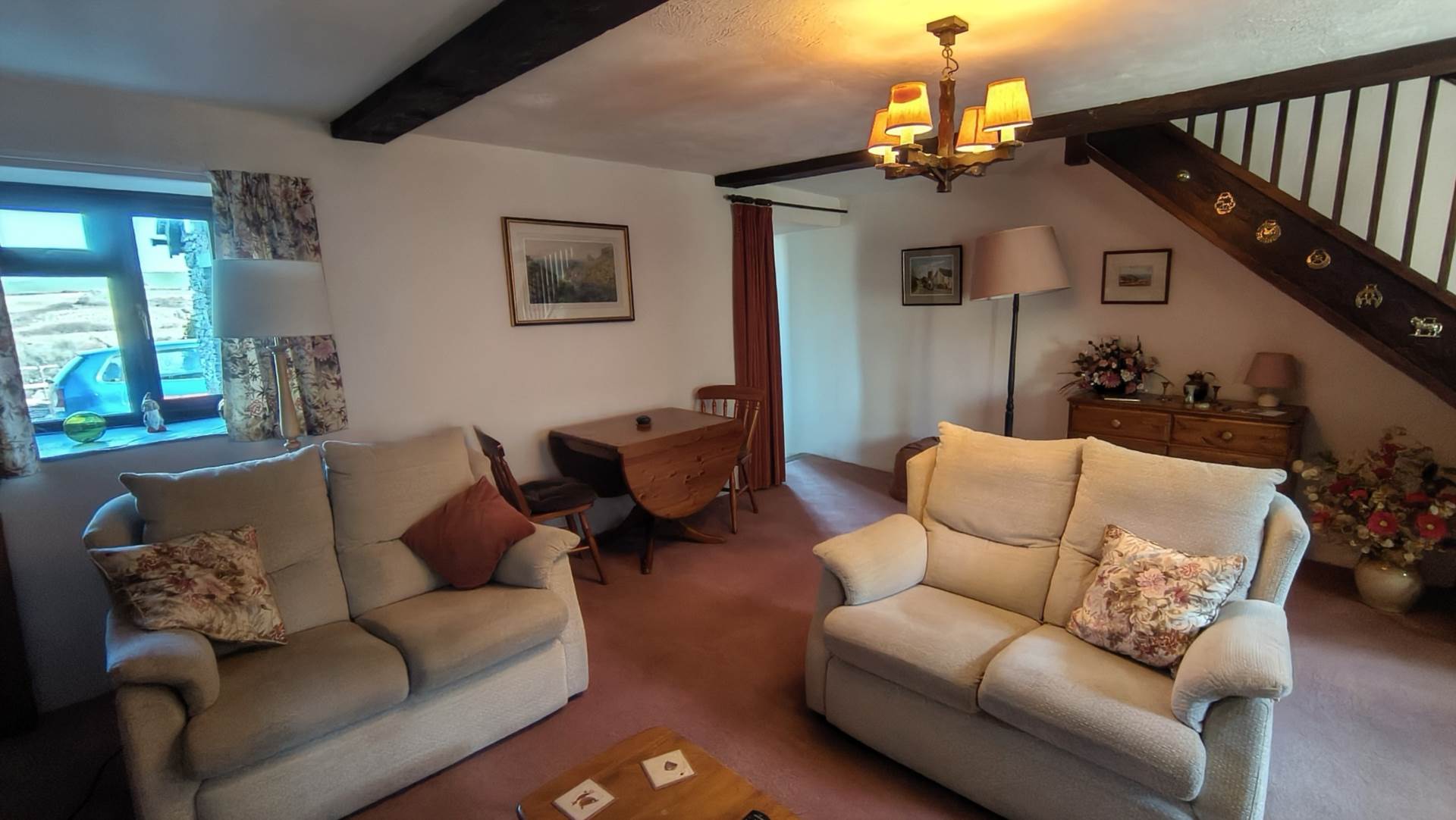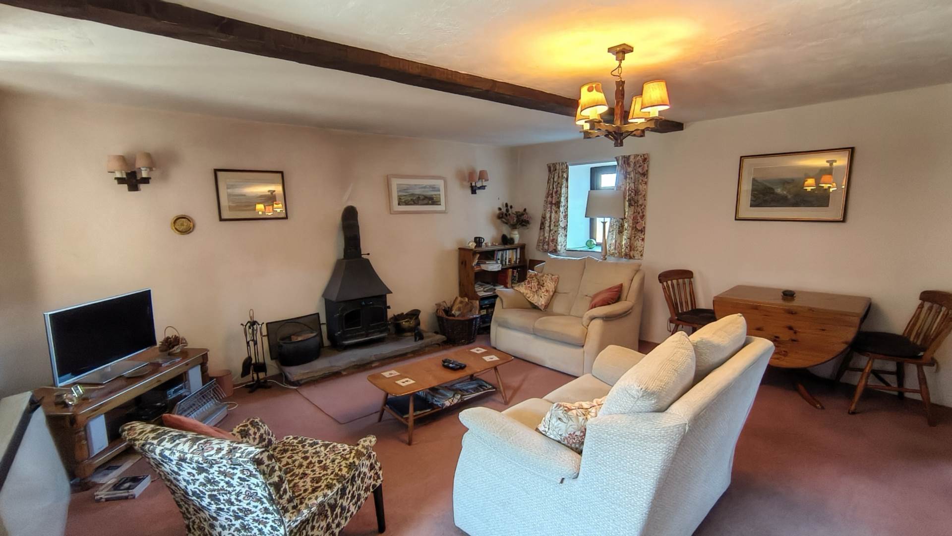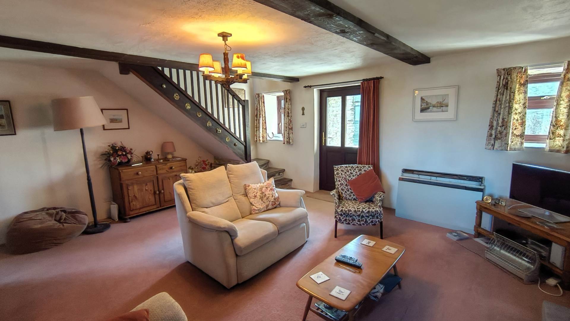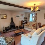 A light and bright, large open space with a window to the front aspect as well as two windows with slate cills and a upvc door to the rear aspect. Log burner on a stone hearth. Turning staircase to the upper floor. Beamed ceiling. Storage radiator.
