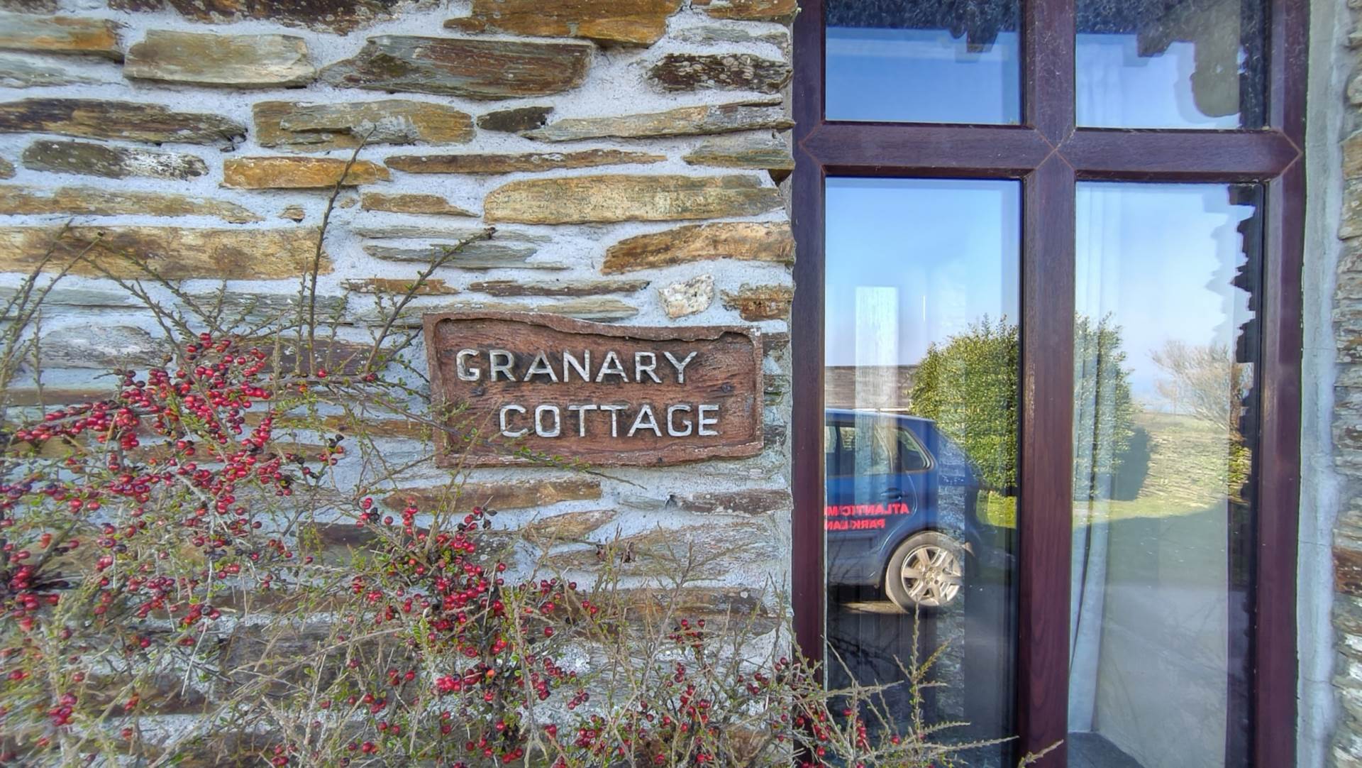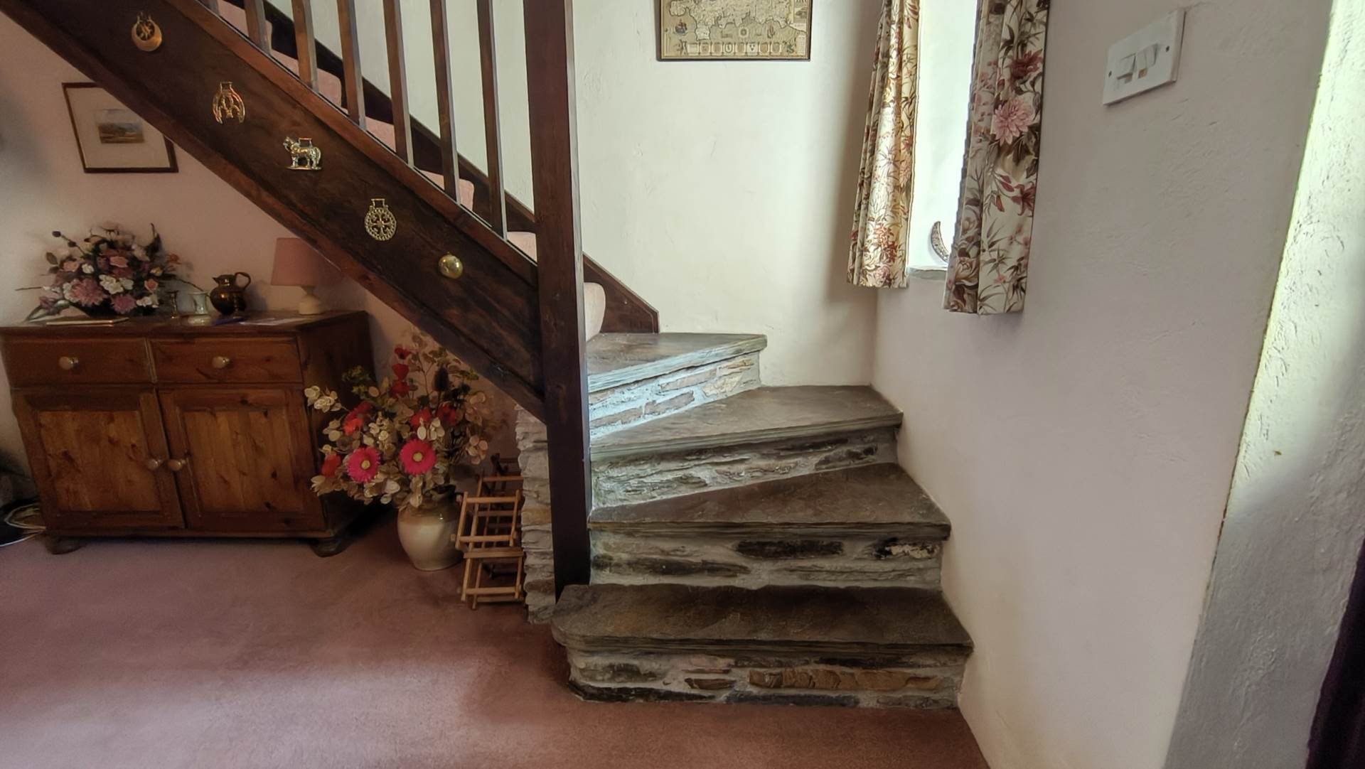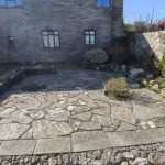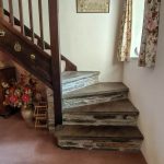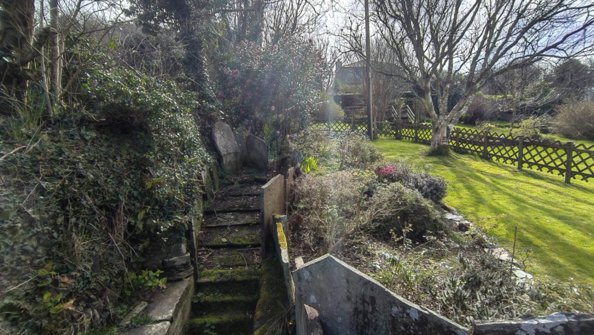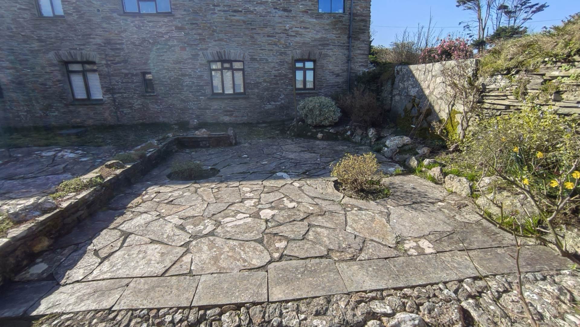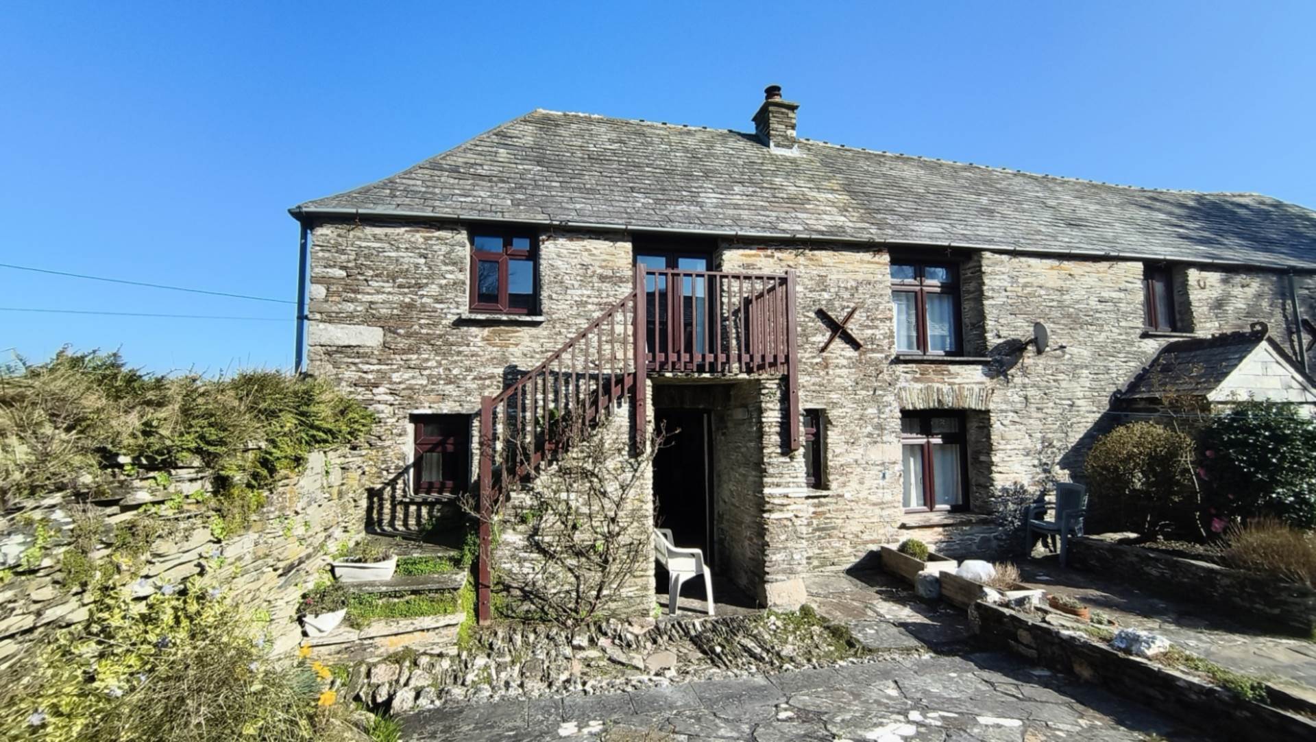 Slate paved courtyard with a low stone border wall with planting. Wooden stairs rise to the balcony outside bedroom 1. Storm porch with access to the rear door.