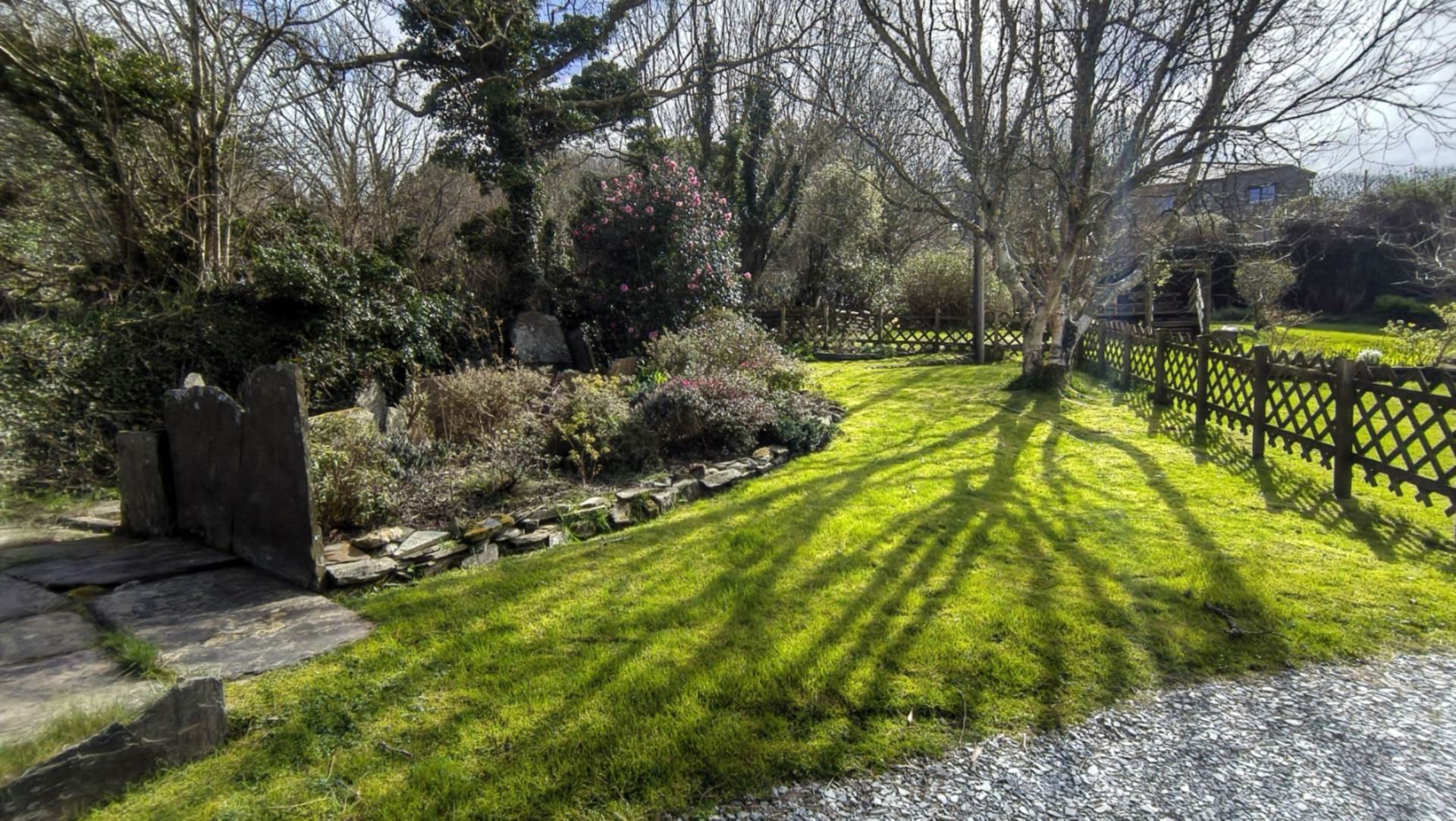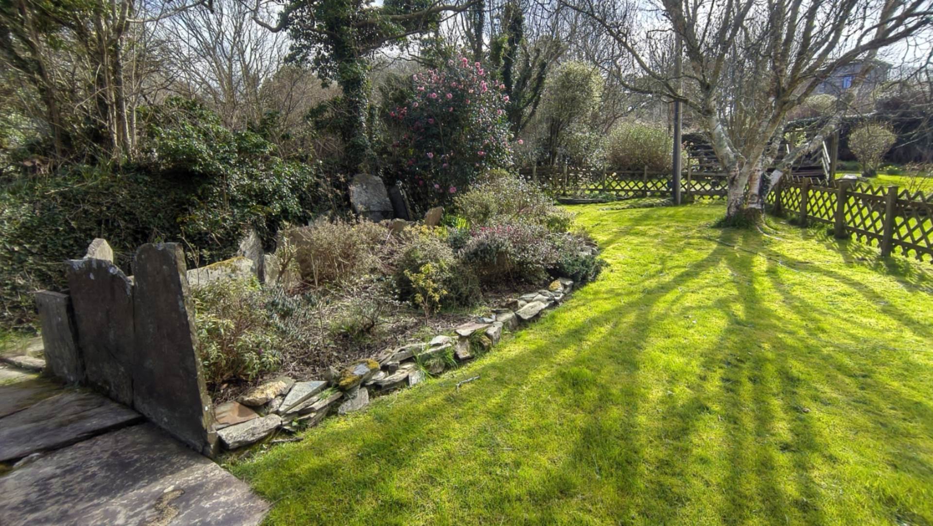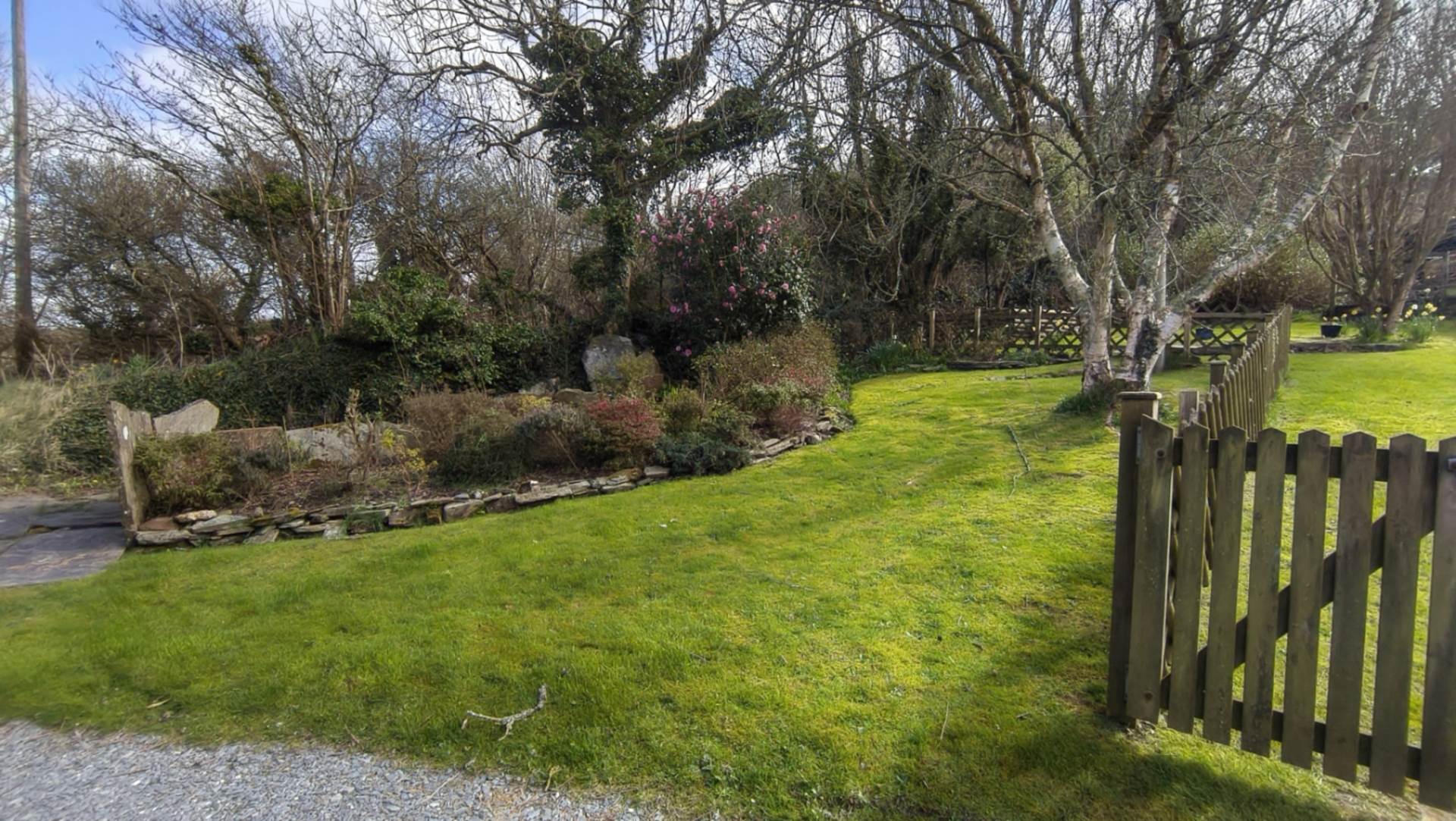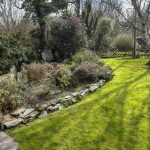 Set to the rear of the property, across from the garage. The garden is a very pleasant area to relax in with a `sheep dip` feature to one side and an attractive silver birch tree planted in the middle of a well tended lawn area.