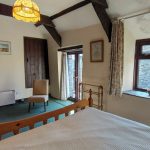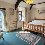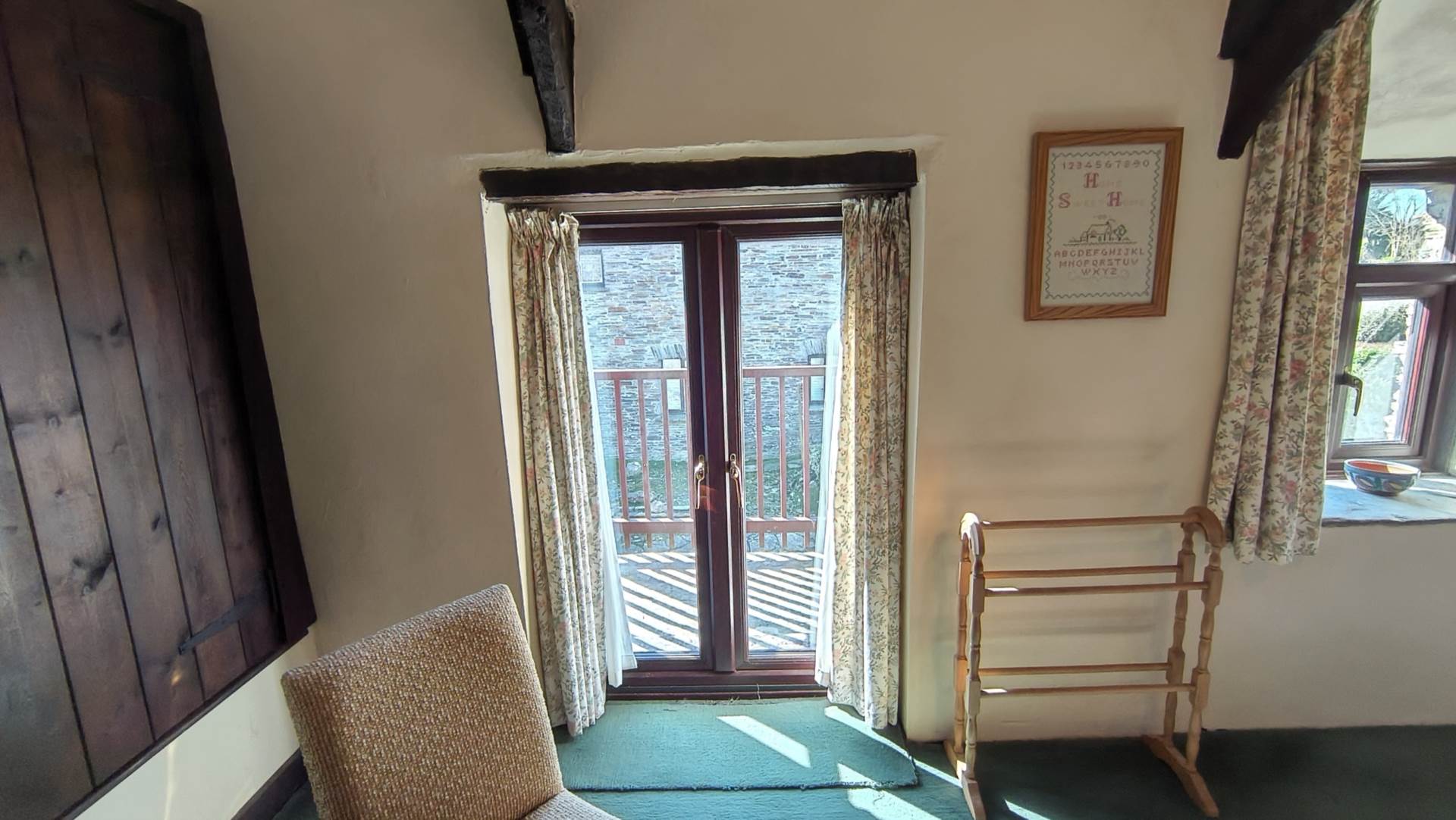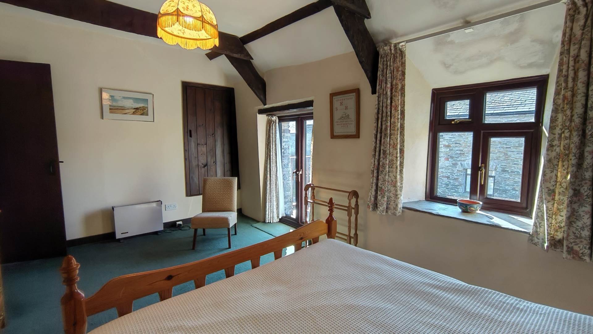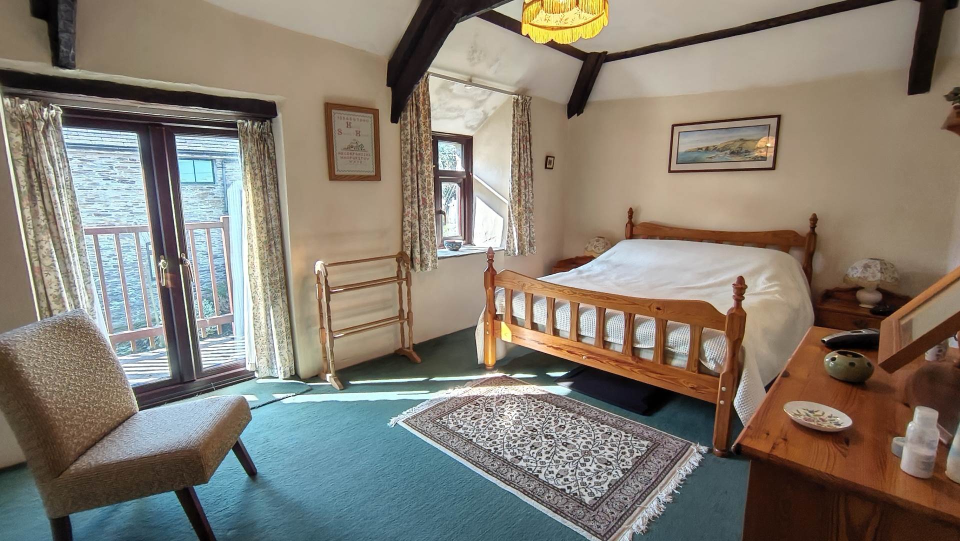 Large double bedroom with beamed ceiling and built in, above stairs storage cupboard/wardrobe. A upvc window and patio doors look out onto the rear courtyard. The patio doors open onto a balcony with steps leading down to the rear courtyard.