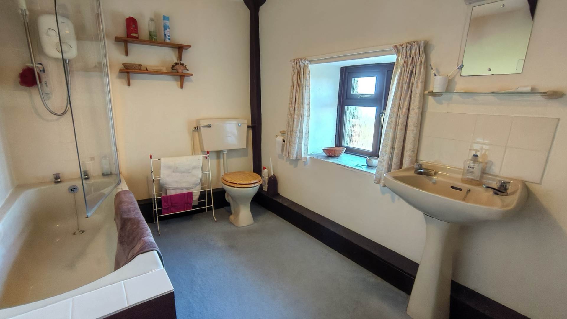 Good sized bathroom for the property with a panelled bath with electric shower over and glass splash screen. Low level WC, and pedestal wash hand basin. Opaque window to the front aspect with a slate cill.