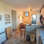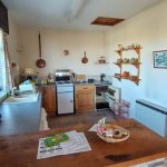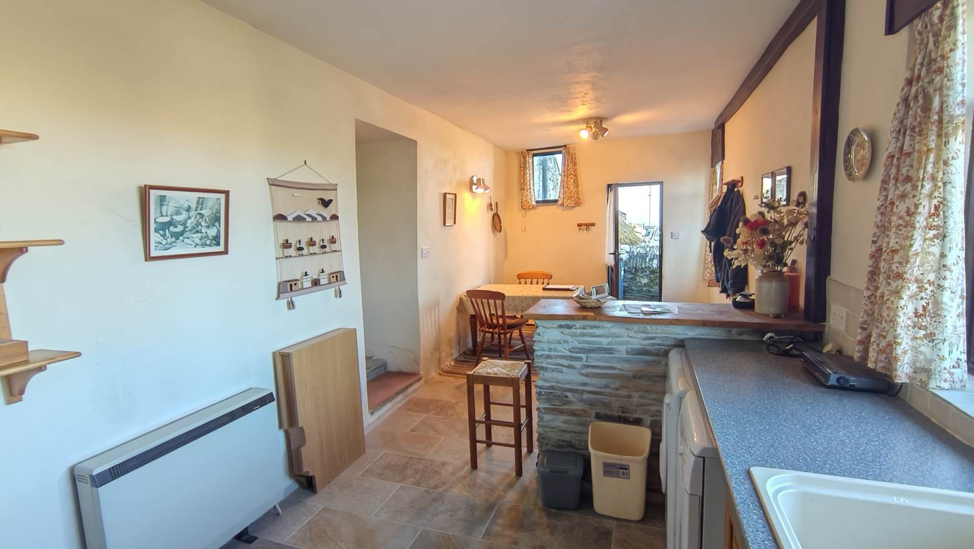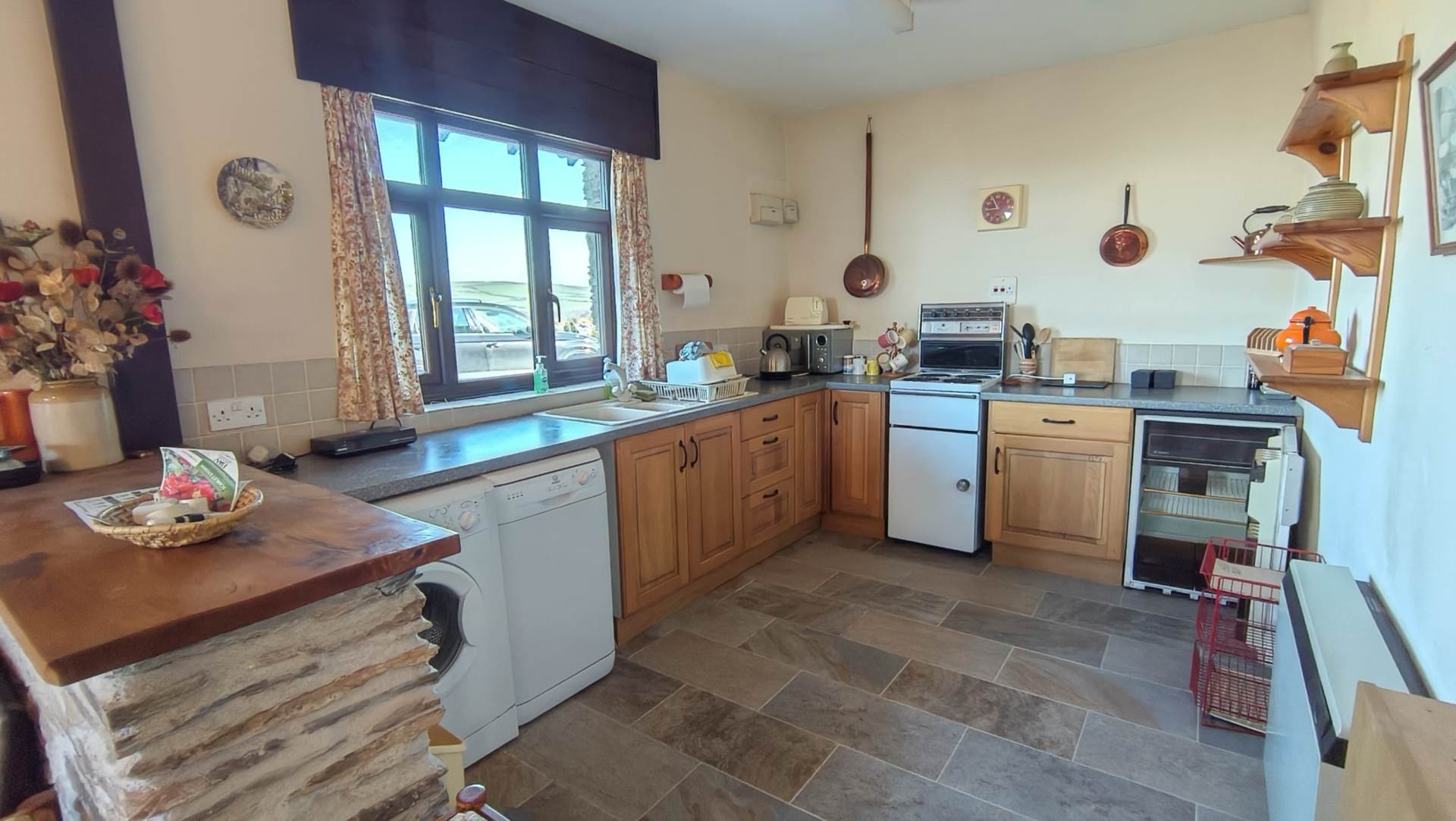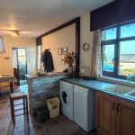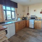 Just inside the wooden, part glazed door is an open plan kitchen/dining room ideal for entertaining. The dining area is large enough for a six to eight seat dining table with a stone built breakfast bar separating the dining area from the kitchen. Two windows look out to the front over open countryside and to the sea and a further high level window to the side aspect. The kitchen is well appointed with light oak base units and grey granite effect roll top work surfaces. There is plenty of room for all white goods including a cooker, dishwasher, washing machine, and fridge. There is a composite one and a half bowl sink with mixer tap. Stone tiled floor and storage heater to one wall.