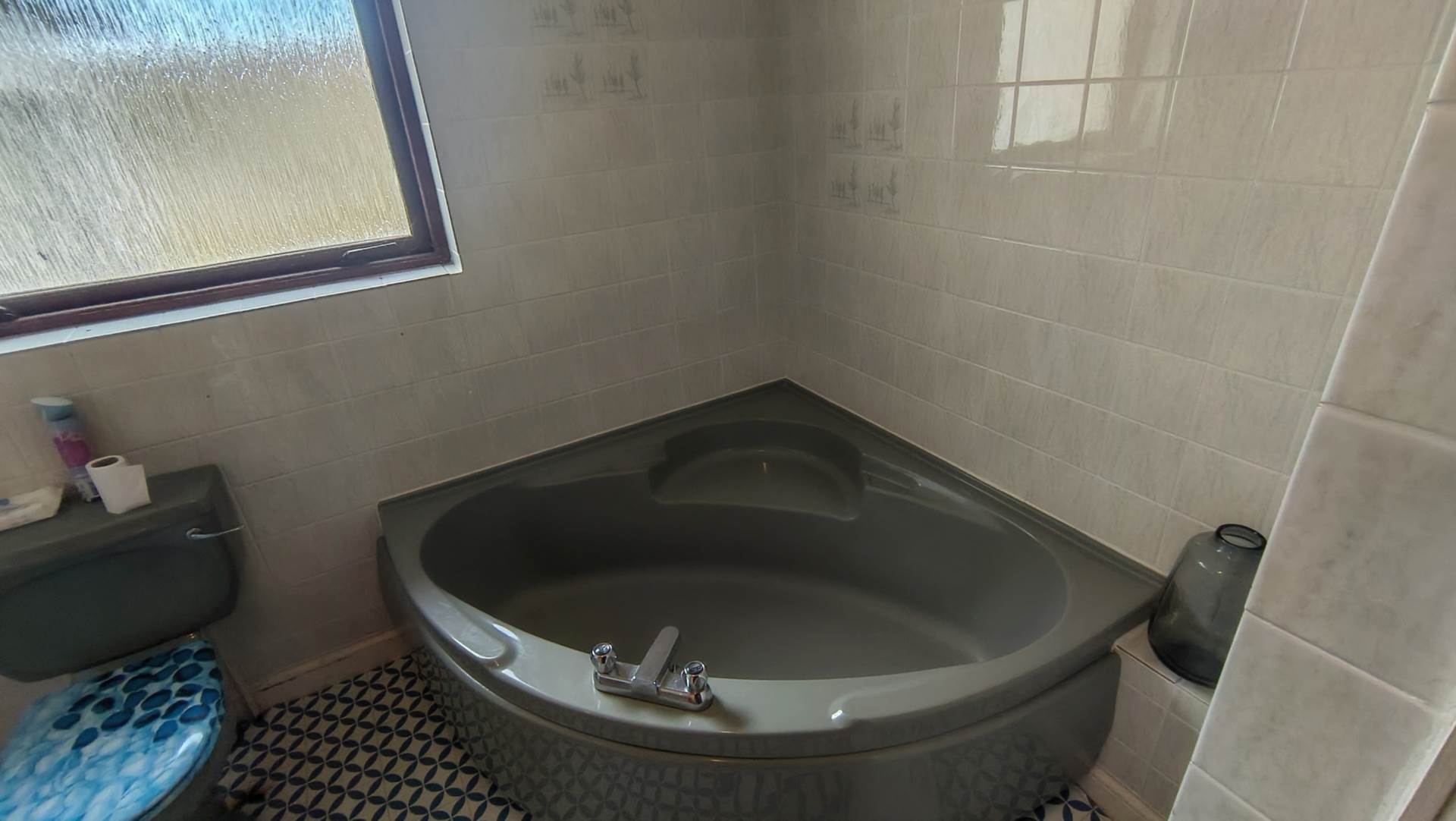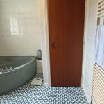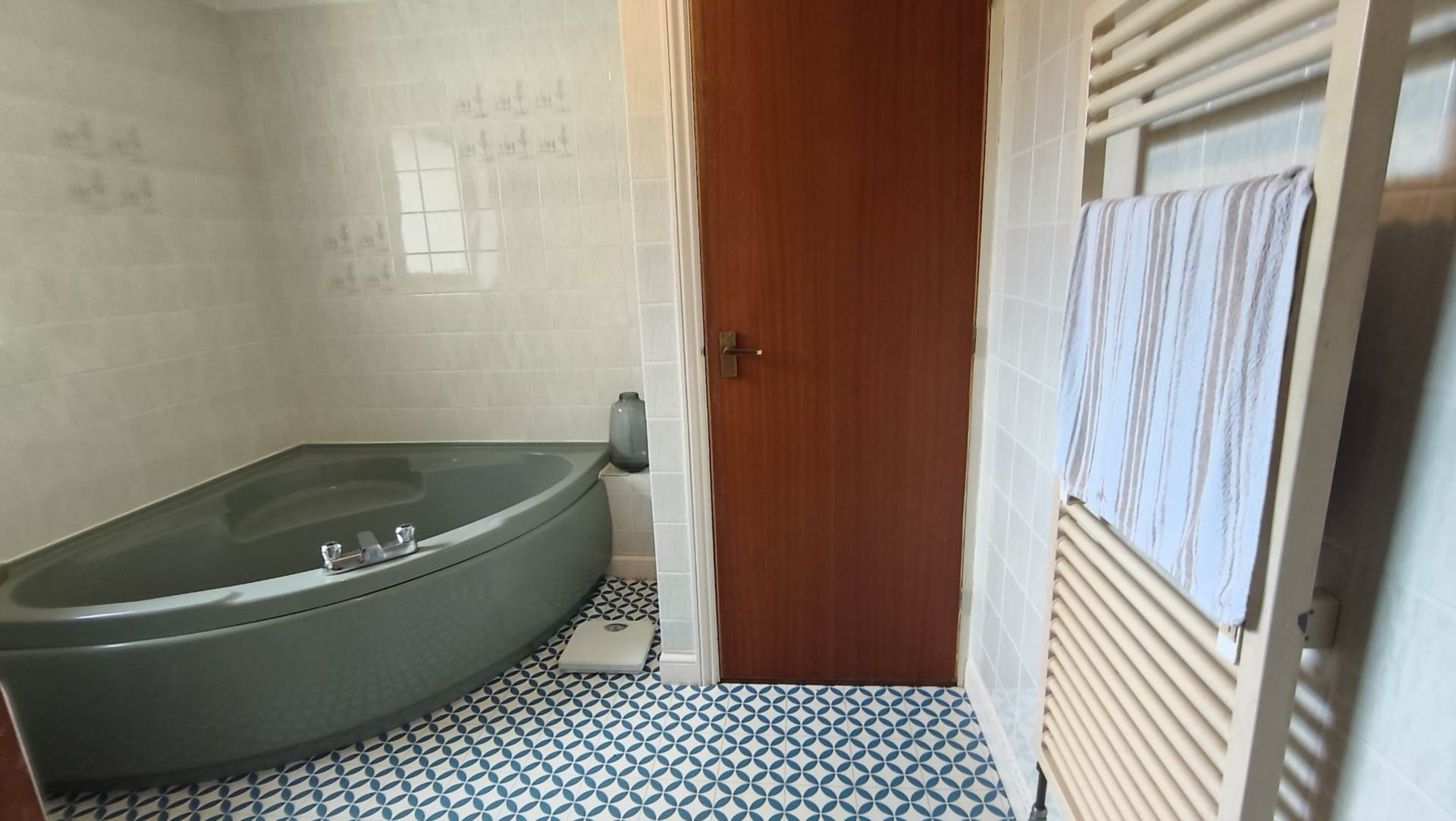Suite comprising a large corner bath, pedestal wash hand basin, and low level WC. Window to the side aspect. Heated towel rail. Cupboard housing the modern hot water tank.