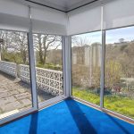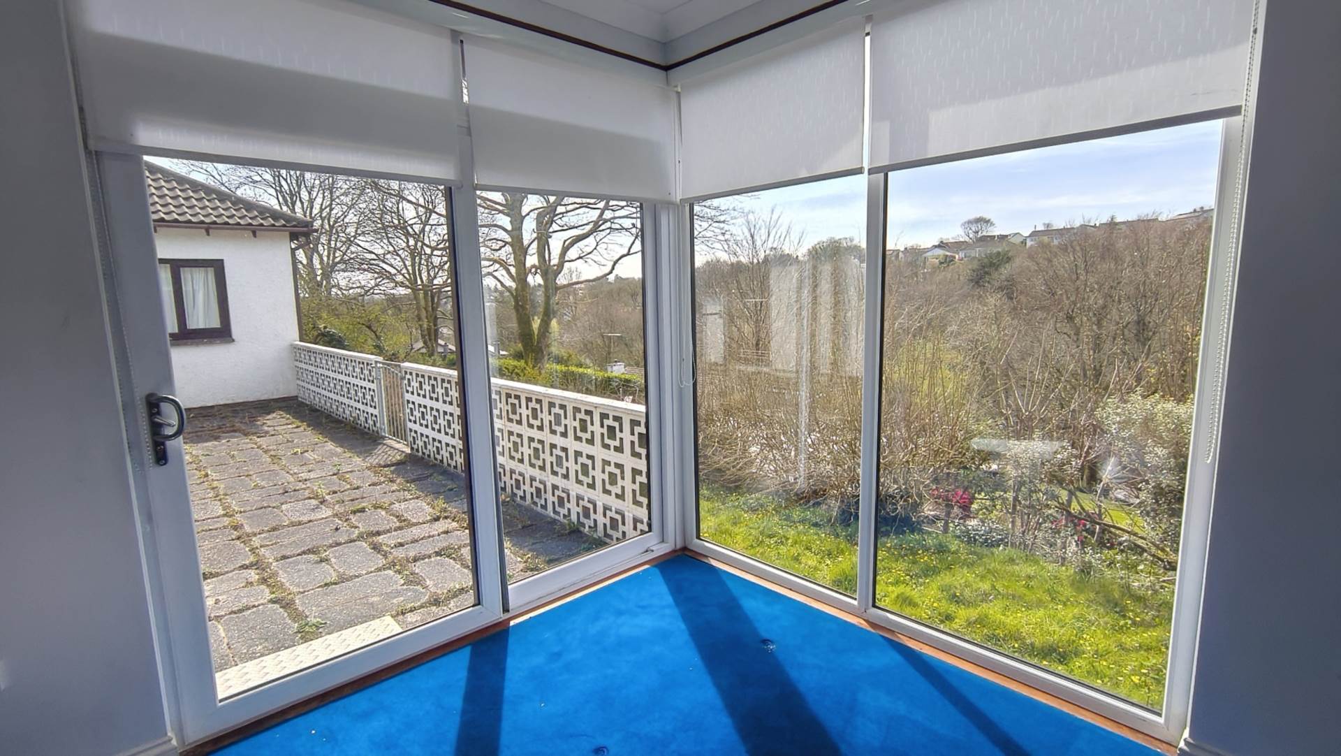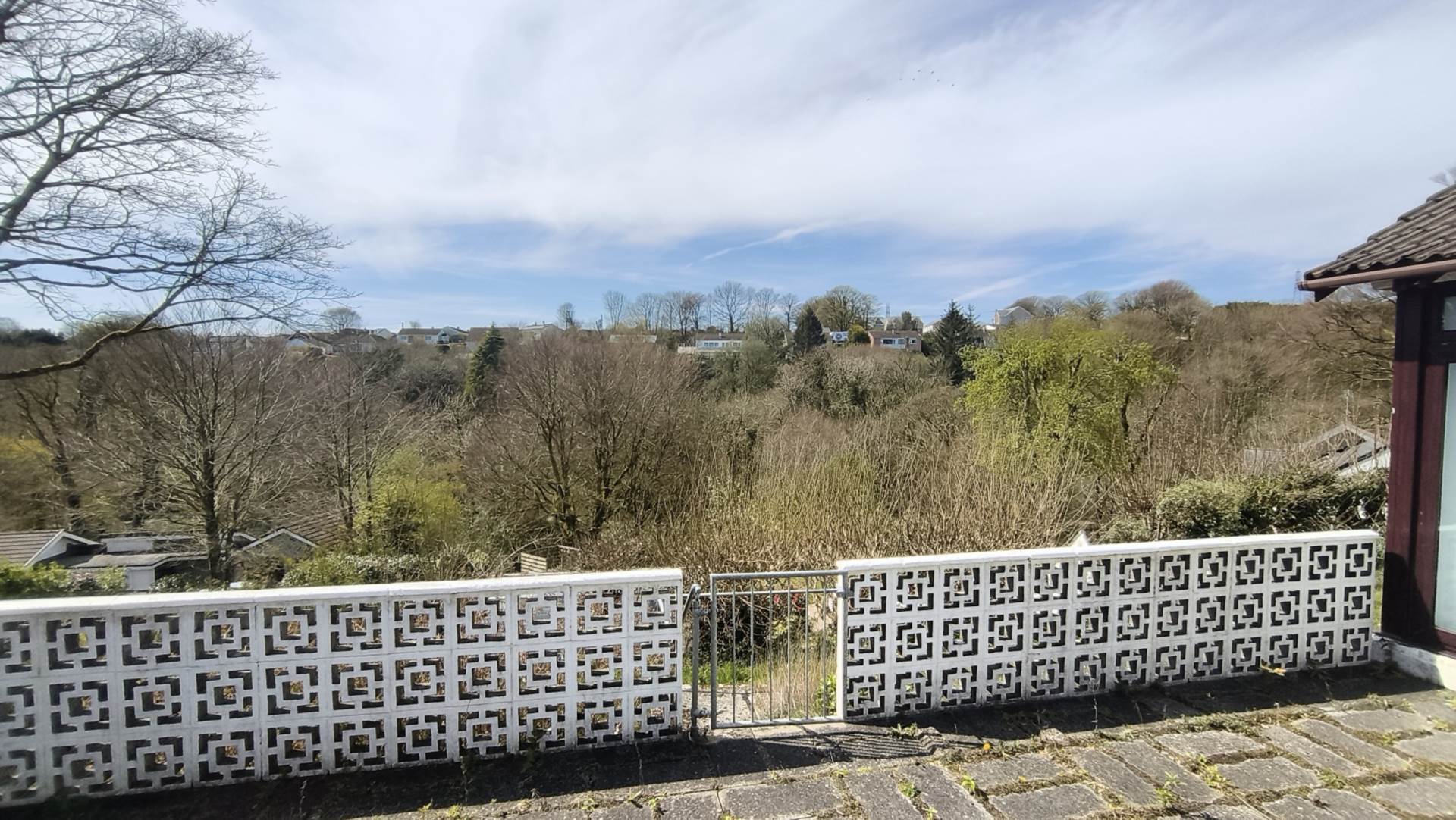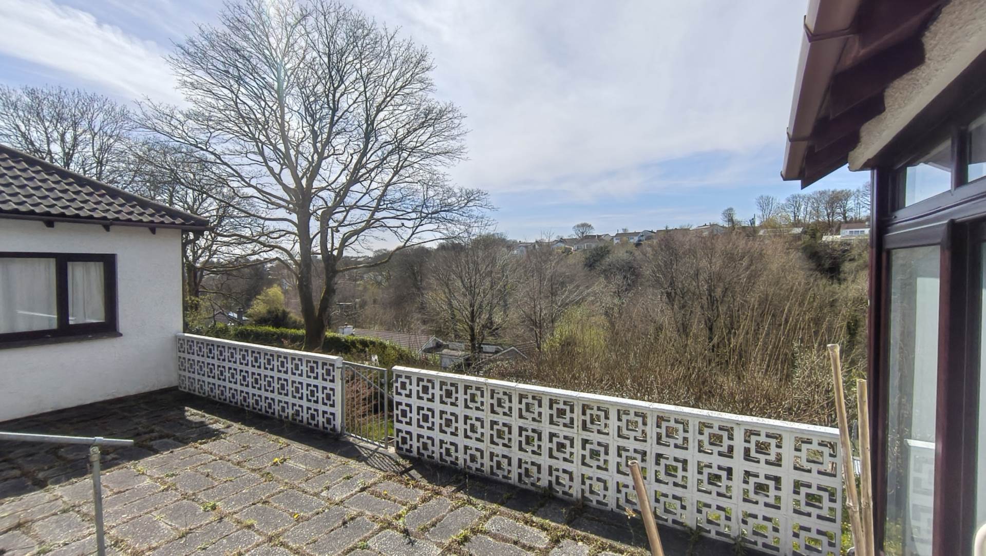 The path continues around to the other side which has extensive views over Camelford. Steps and grab rail rise to a large patio area which is laid with slabs. The patio makes the most of the views and is sheltered on both sides by the property. There is also access to the lounge and the utility room.