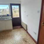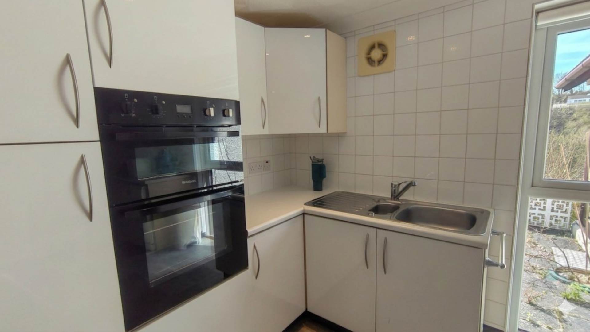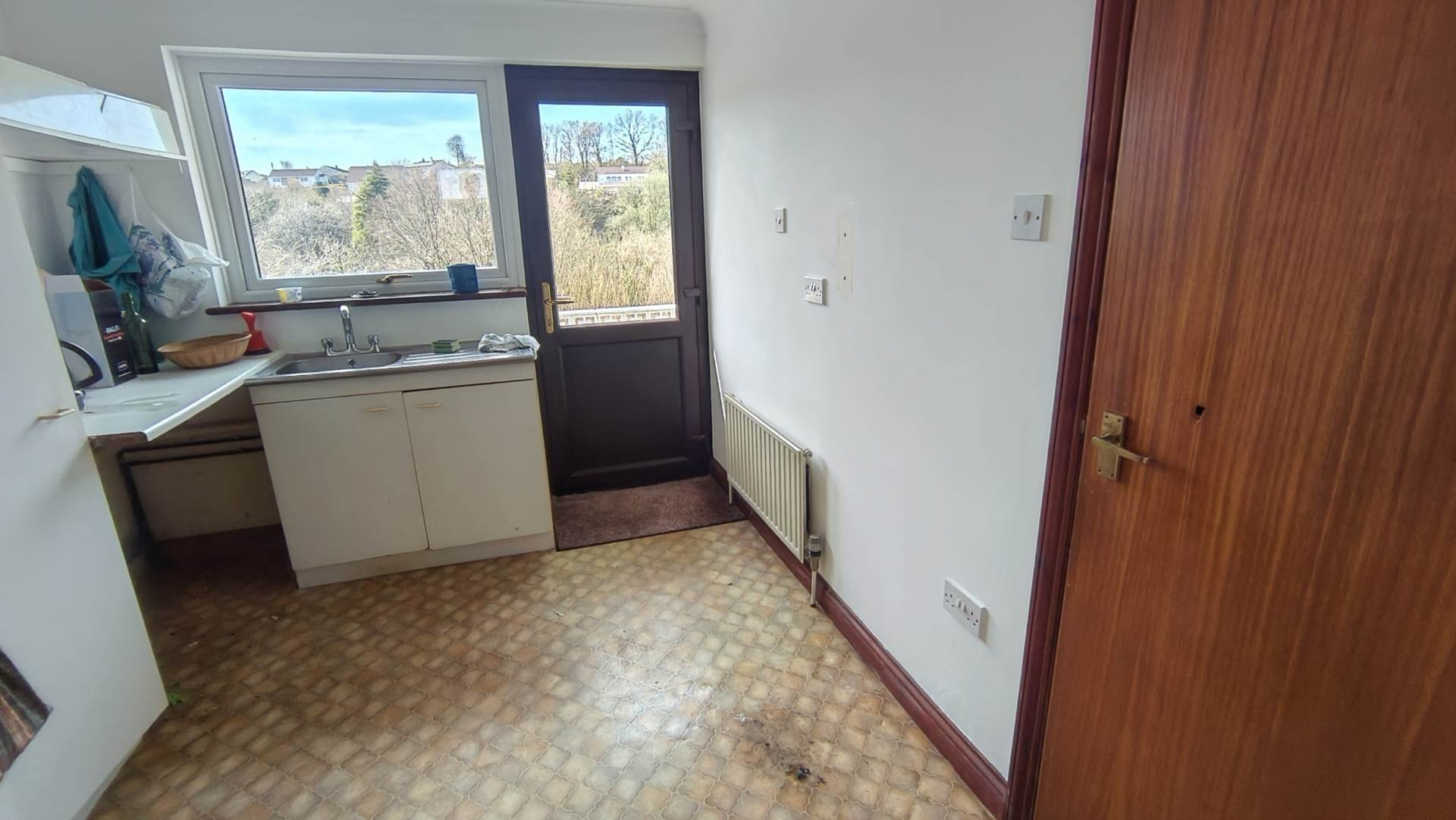 Four tall storage cupboards to one wall. Sink unit to the rear with work top. Window and glazed door to the side aspect with views over the patio and Camelford beyond. Strip light.