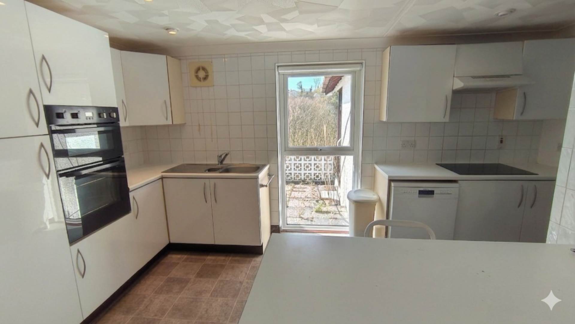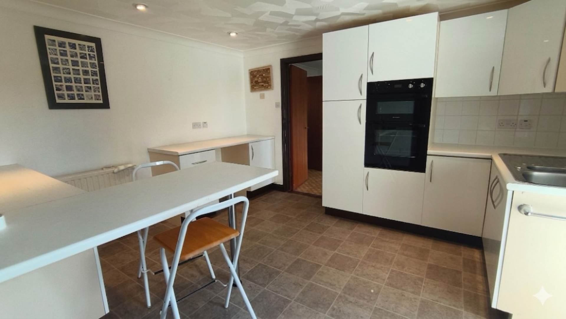 White wall and base units with white work tops. Inset stainless steel sink with mixer tap. Inset four ring hob with extractor over. Eye level oven and grill. Doors to the hallway and the utility room. Full length window to the side aspect. Radiator.